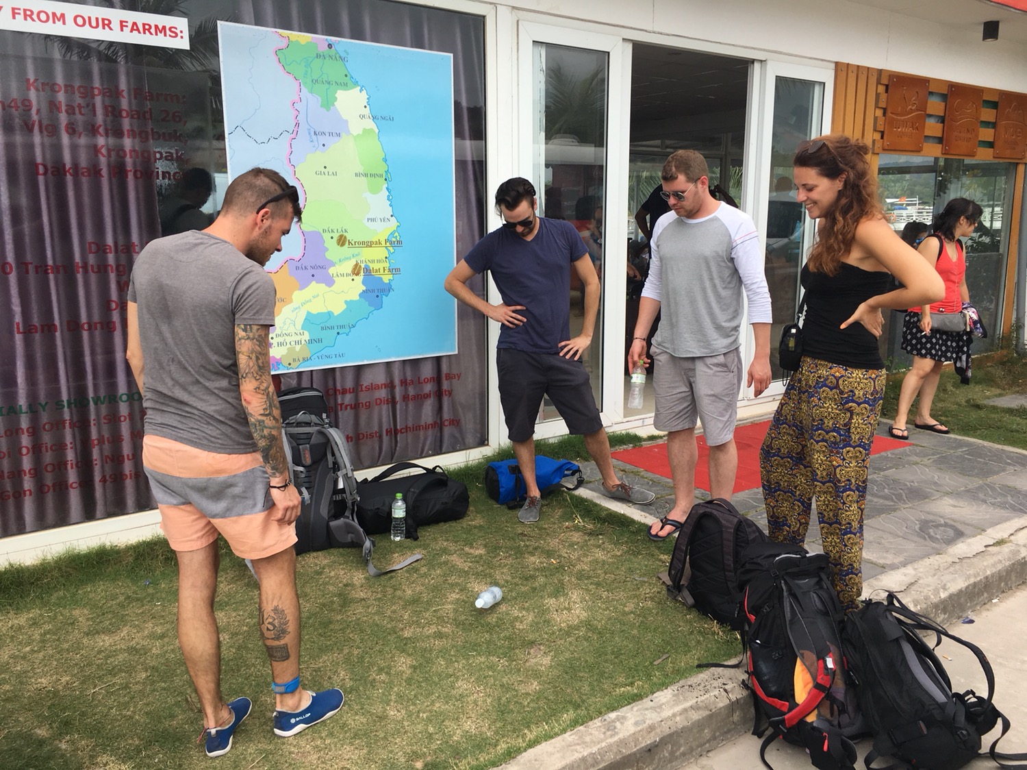So wie wir angereist sind, reisen wir wieder ab. Bevor uns der Bus aus der Bucht abholt, matchen wir uns gegenseitig im Flaschenwerfen. Ziel ist, dass die volle PET-Flasche eine ganze Drehung macht und dann am Boden stehen bleibt. Ein Vietnamese neben uns ist begeistert und steigt in die Runde ein. Kurtl ist der einzige, der es schafft. Wir applaudieren und grölen lautstark.