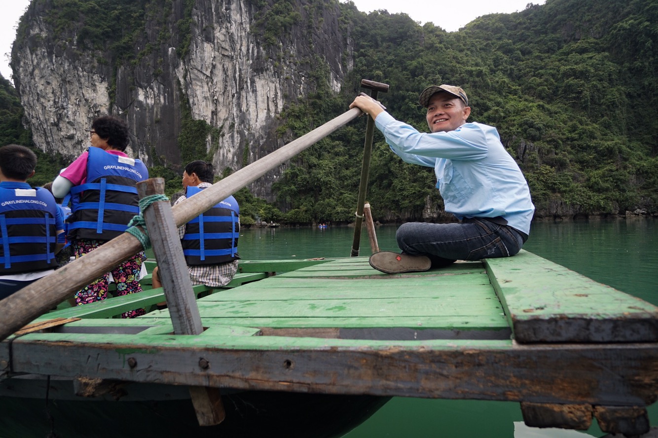 Die Rudertechnik interessiert mich und ich frage den vietnamesischen Steuermann, ob ich auch einmal probieren darf. Erstaunt aber mit seinem Einverständnis darf ich an die Ruder. Nicht nur Kevin hält den Moment mit der Kamera fest, auch die Inder fotografieren und filmen, sowie die Chinesen in den nebenan schwimmenden Booten. Die fotografieren sowieso alles und jeden und vielfach.