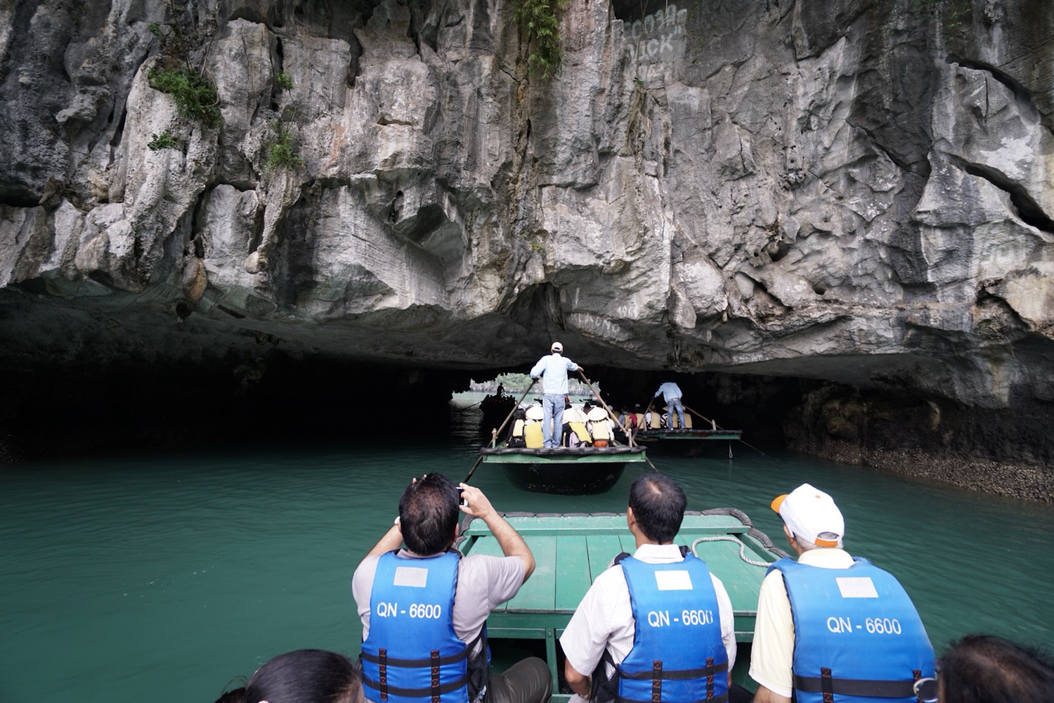 Heutiges Ausflugsziel ist wieder Kanufahren, alternativ kann man sich aber auch mit einem mehrsitzigen Ruderboot befördern lassen. Kevin und ich wählen heute die zweite Option und setzen uns mit den älteren Indern in das Ruderboot. Gesteuert wird das Boot mit zwei langen, flachen Paddeln, die im Stehen vom Heck aus gedreht, gedrückt und gezogen werden. Wir fahren durch einen Tunnel in eine abgeschottete Bucht, die nur von hier aus zugänglich ist. Neben uns ragen die grünbewachsenen Steinwände empor, nur die sehr steilen Stellen sind ohne Bewuchs.