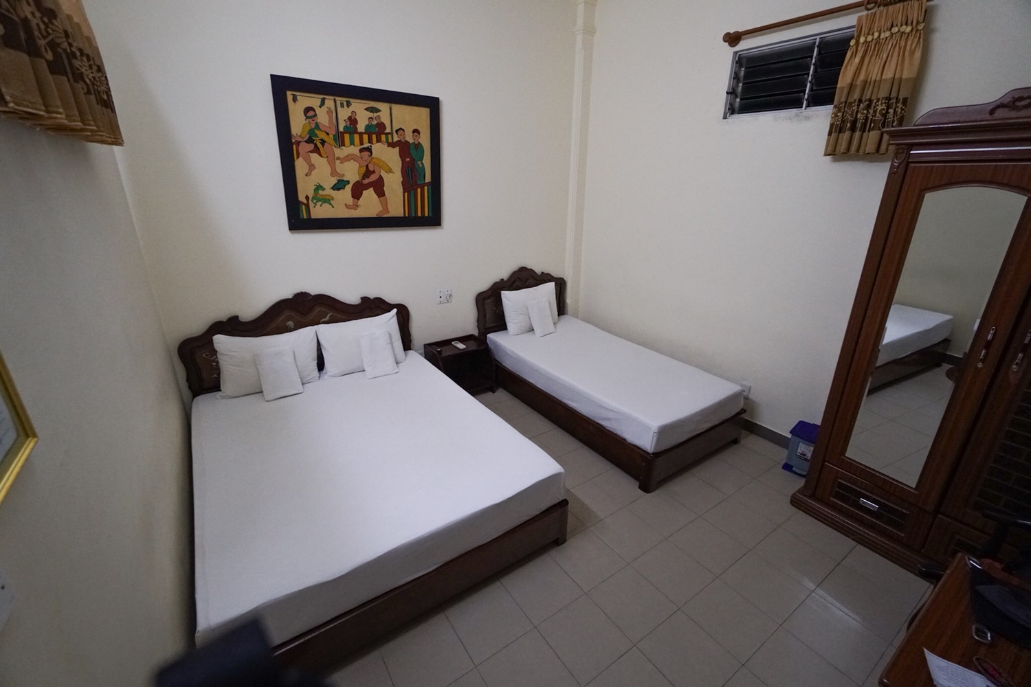Leider haben wir uns beim Buchen vertan und es wird uns ein Doppelbett-Zimmer gezeigt. Wir wechseln auf ein Dreibettzimmer, das nur einen Pappenstiel mehr kostet. Schere/Stein/Papier entscheidet, wer das Doppelbett und wer das Einzelbett bekommt. Kevin gewinnt durch einen Schnitt in mein Papier mit einem Gesamtergebnis von 2:1. Das große Bett geht an ihn.