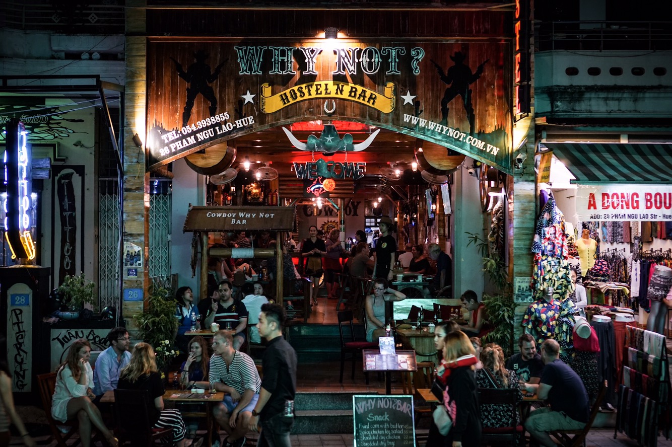 Der Taxler schmeisst uns raus und Google Maps weist uns den Weg zum Hostel. Heute ist Samstag und die Straßen dieses Häuserblocks sind gesperrt. Hier wird für eine Nacht eine Fußgängerzone daraus, wo normal der Verkehr durchsaust. Alter Schwede! Hier steppt der Bär! Lautsprecher, so groß wie ich, sind direkt auf die Straße gerichtet. Elektronische Musik dröhnt von Hauswand zu Hauswand und wir fühlen uns mittendrin wohl. Hier sitzen sogar mehr Einheimische als Touristen vor den Lokalen. Erstmal suchen wir unser Hostel. Dieses liegt direkt auf einer solcher abgesperrten Straßen.