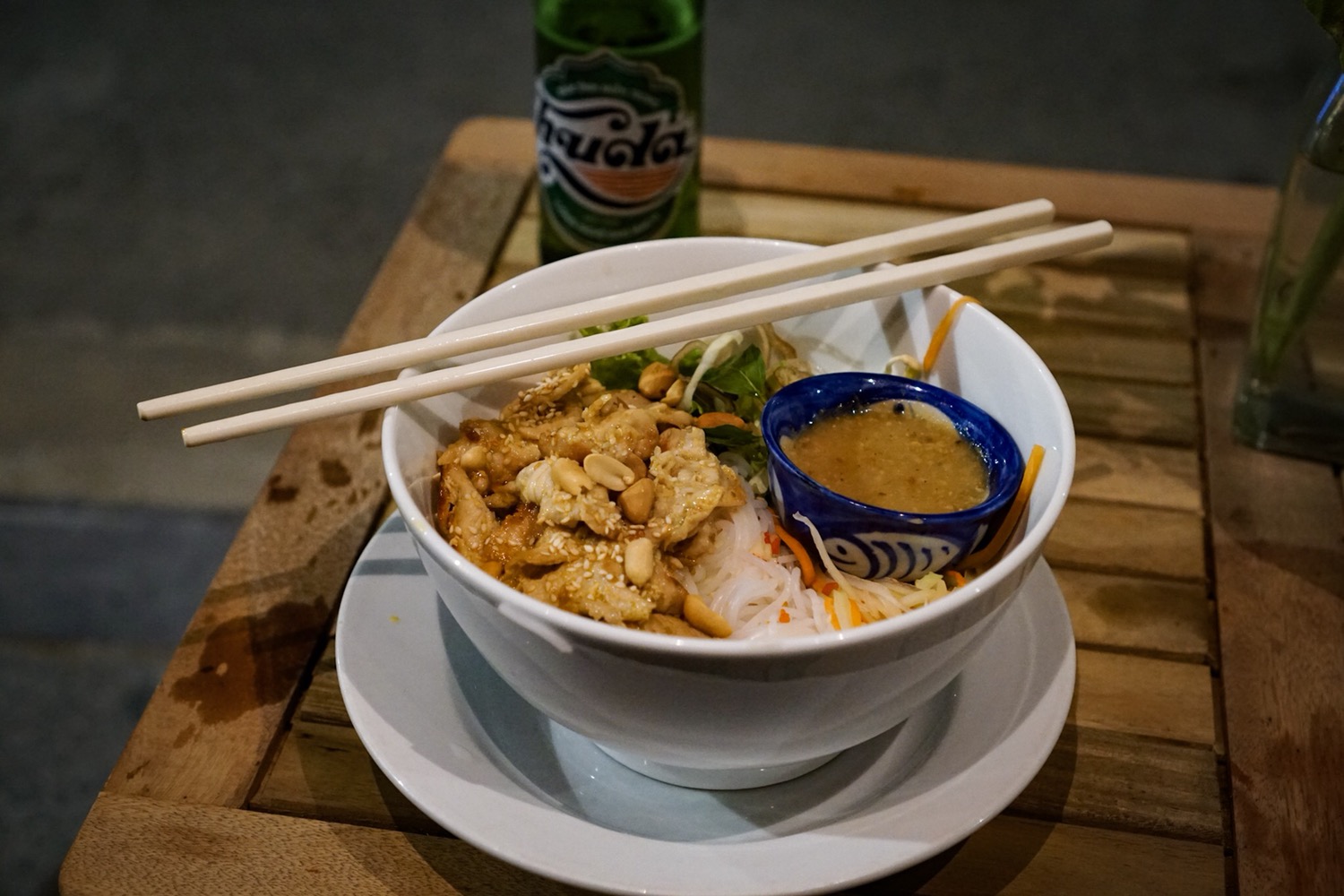 Im nächsten Lokal „Little Owl” essen wir die Hauptspeise. Für Kevin gibts gebratenen Reis mit Gemüse und ich bestelle mir Reisnudeln mit Schweinefleisch. Nach den Tagen mit Besteck am Boot, freue ich mich über die Stäbchen 😍.