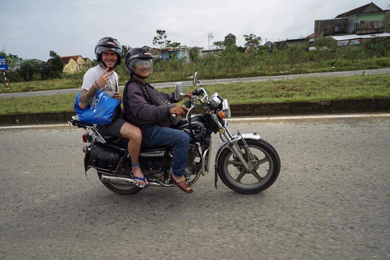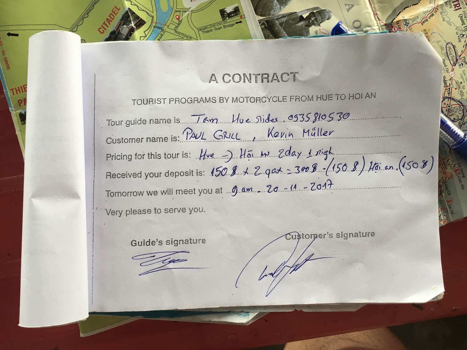 „Scheiss’ drauf!” – Schlussendlich sind wir ĂŒberzeugt und entscheiden uns fĂŒr eine Zwei-Tages-Tour in der Gegend, die in Hue startet und in Hoi An endet. Genau dort mĂŒssen wir nĂ€mlich demnĂ€chst hin. FĂŒr heute haben wir bei ihnen noch eine Tagestour in Hue dazugebucht. Wir machen noch Fotos von uns am Tisch, unterschreiben einen Vertrag und werden zurĂŒck zum Hostel gebracht.