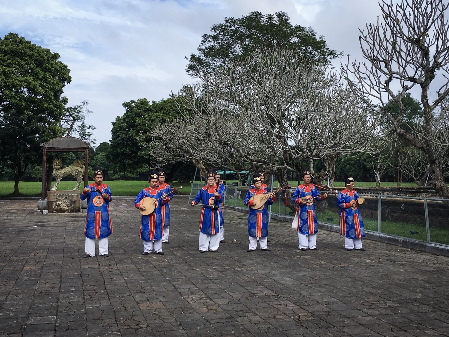 Mit dem strahlendsten LĂ€cheln und komplett geflashed von der letzten halben Stunde, betreten wir die Zitadelle. Dort haben wir schon wieder großes GlĂŒck, weil gerade eine traditionell vietnamesische Volksmusikgruppe live aufspielt.