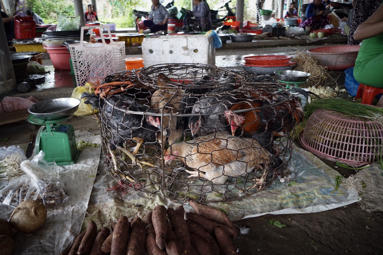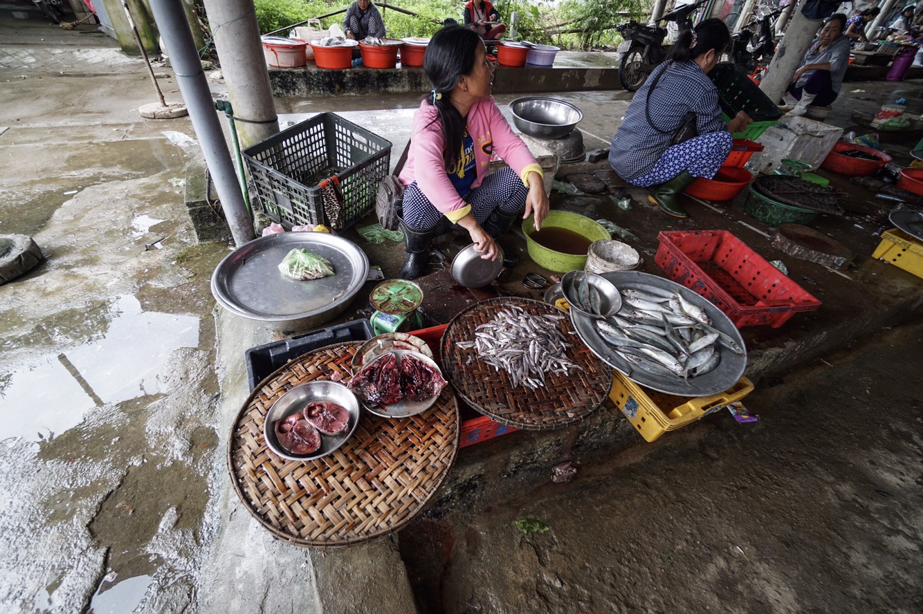 Die beiden Guides kommen so pĂŒnktlich, das sich das Bier nur im Fast-Forward Modus ausgeht. Helm auf, hinten aufhĂŒpfen, Motoren starten und rock‘n‘roll! Wir entfernen uns vom Stadtkern und biegen auf eine Feldstraße ab. Auf der Fahrt sind unsere Hinterteile gut gedĂ€mpft und gefedert. Als erstes halten wir an einer alten BrĂŒcke in einem Dorf außerhalb von Hue. Tam, so heißt der Chef, erklĂ€rt uns, dass die Thamh Toan BrĂŒcke bereits im 18. Jahrhundert erbaut wurde und zur Erhaltung auf FĂŒĂŸgĂ€ngerĂŒberquerungen beschrĂ€nkt wurde. Er zeigt uns auch noch einen Wasserstandmesser, der im Jahr 1999 knapp ĂŒber drei Meter eines der schlimmsten HochwĂ€sser dokumentiert. Außer den BrĂŒckenpfeilern, die immer noch original sind, kann nicht viel stehen geblieben sein. Er zeigt uns auch einen hiesigen Markt, wo es auch lebendes Getier und sonstige Lebensmittel gibt.