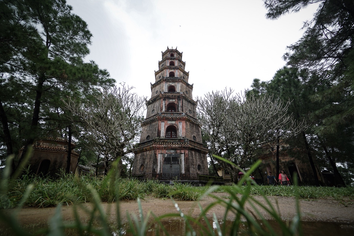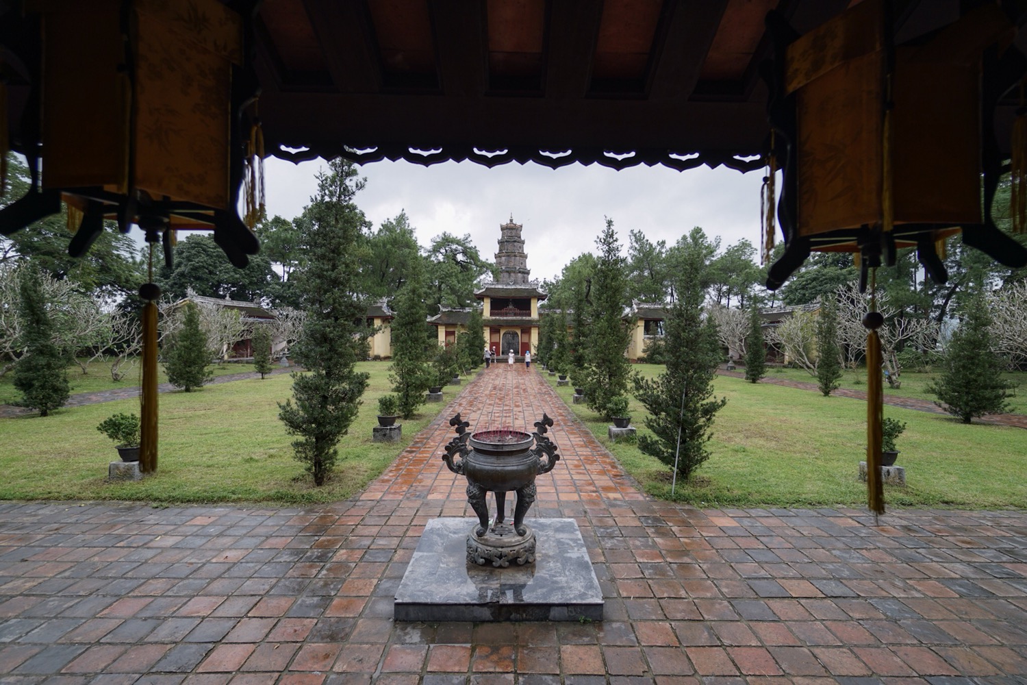 Die kommende Haltestelle ist die Thien Mu Pagode. Ein 22 Meter hohes Bauwerk, dem Buddhismus gewidmet. Uns tun schon die Beine weh, aber wir drehen trotzdem eine Runde in der Tempelanlage, die sich hinter der Pagode entlang streckt.