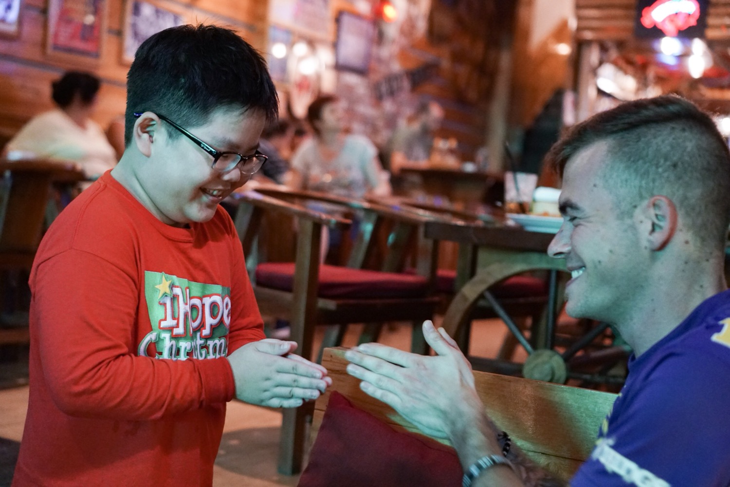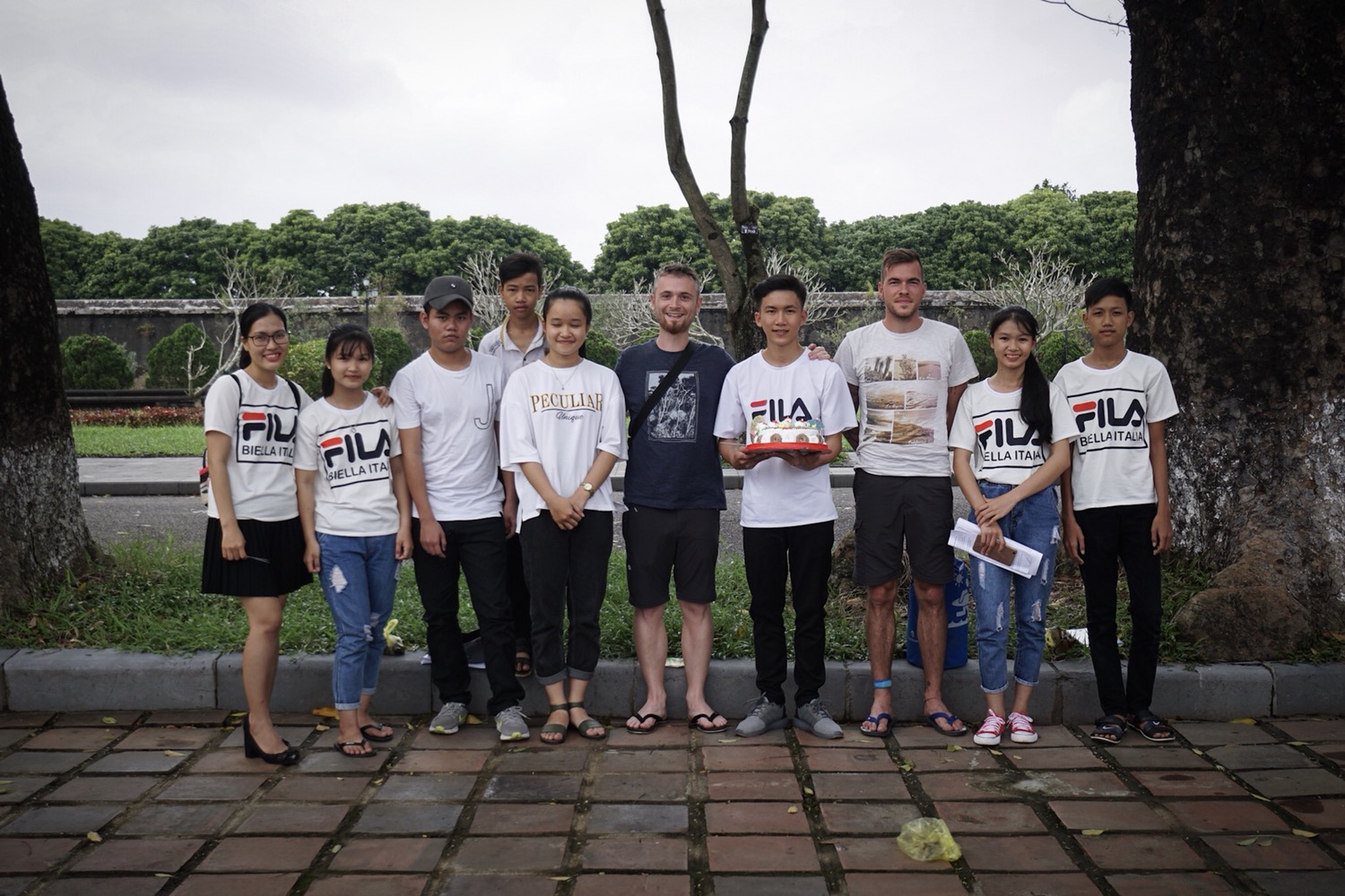 Doch die ganze Geschichte ist noch nicht vorbei! Es stellt sich heraus, dass einer der SchĂŒler Geburtstag hat. Die Lehrerin verschwindet kurz und kommt mit einer Torte wieder (!!!)! SelbstverstĂ€ndlich hat sie auch die SprĂŒhkerzen nicht vergessen. Gemeinsam zĂŒnden wir die Kerzen an und singen mit Reismehl-Schlatze geölter Stimme Happy Birthday. Man darf bei der ganzen Situation bitte nicht vergessen, dass wir uns an einem absoluten Touristen-Hotspot befinden! Hinter und vor uns laufen haufenweise Leute vorbei, die uns anlĂ€cheln. Aus „bizarr” wurde „herzerwĂ€rmend spitze und lustig”. Zu guter letzte, muss jeder dem Geburtstagskind seine persönlichen WĂŒnsche fĂŒr die Zukunft kundtun. Kevin ist als erster dran und wĂŒnscht ihm ein Leben lang Gesundheit und alles GlĂŒck der Welt fĂŒr seine Zukunft und nachdem er sich in der Vorstellrunde als Real Madrid Fan outete, wĂŒnscht ihm Kevin noch, dass er der berĂŒhmteste Fußballspieler, noch berĂŒhmter als Christiano Ronaldo, werden soll. Ich wĂŒnsche im, dass er in der Zukunft eine wunderschöne Frau zur Ehefrau nehmen darf. Er bedankt sich herzlichst bei uns und wir verabschieden uns von der Gruppe. Doch ohne ein gemeinsames Foto können wir nicht auseinander gehen.