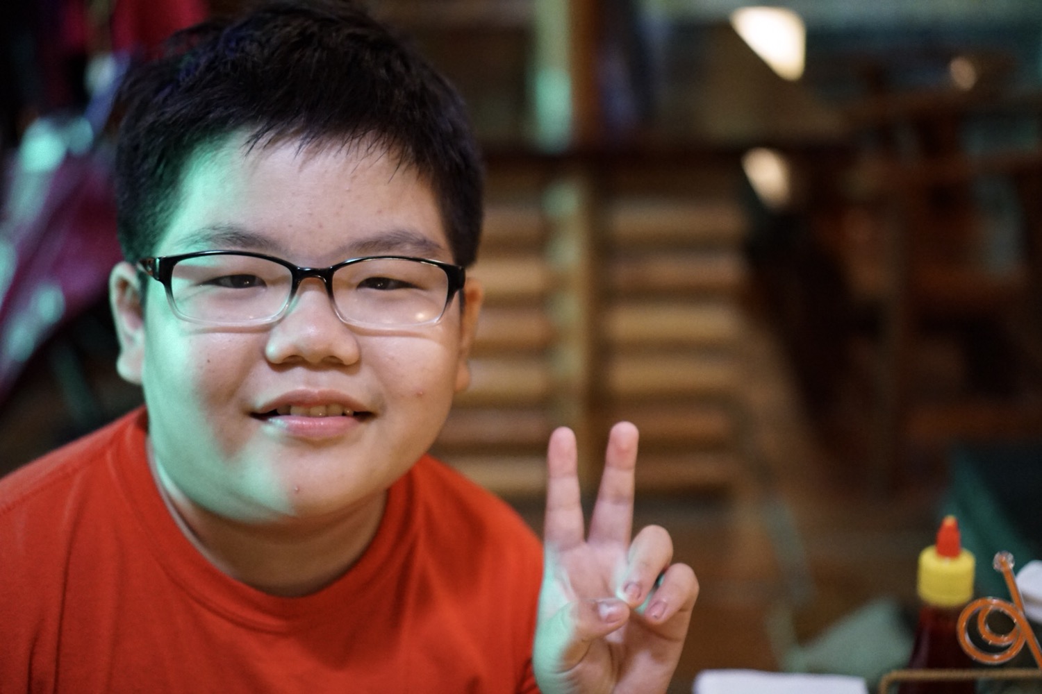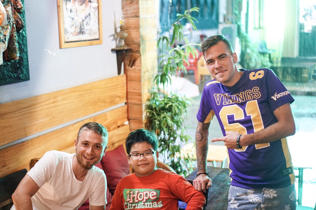 Ok, ich mach‘s heut noch. Der Regen hĂ€lt uns im Lokal fest, weshalb wir auch die Hauptspeise hier essen. Im Laufe des Abends kommt immer wieder ein junger Bursch zu uns. Er spricht sau gut Englisch fĂŒr einen Vietnamesen. Irgendwann bleibt er bei uns hĂ€ngen. Kevin unterhĂ€lt ihn die erste halbe Stunde. Dann bin ich eine Zeit lang dran. Seine Mutter sitzt einen Tisch weiter oben. Es stellt sich raus, dass er der Sohn des EigentĂŒmers ist. Wir haben ordentlich Spaß mit dem Burschen, der nebenbei erwĂ€hnt auch noch blitzgescheit ist. Skurril ist, dass dir ein Elf-JĂ€hriger erzĂ€hlt „You know, the grass is always greener on the other side.” und eine halbe Stunde spĂ€ter wird ihm von seine Mutter die Jacke angezogen.