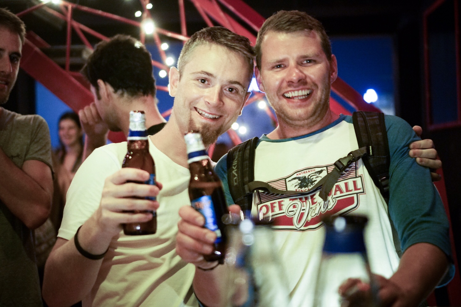 Nach der Jause mĂŒssen wir zurĂŒck ins Lighthouse. Wir wissen aber nicht wo zum Teufel die Bar ist oder wie die Adresse lautet. Auch die Taxifahrer kennen‘s nicht. Deshalb hĂŒpfen wir bei irgendjemandem(!) auf den Roller, der uns aus mir unerklĂ€rlichen GrĂŒnden tatsĂ€chlich nicht in eine dunkle Ecke verschleppt, sondern genau vor der TĂŒr der Lighthouse Bar absetzt. Kurtl hat aufgepasst, dass ich nicht vom Sattel rutsche. Da Kurtls Eintritts-Stempel auf der Hand nicht mehr erkennbar ist, bezahlt er noch einmal Eintritt. WĂ€hrend der ganzen Aktion ist mein Puls auf 240, oder sogar höher. Es stehen einige Gigabyte an Erinnerungen der letzten Tage auf dem Spiel. Oben bei der Bar fragen wir den Kellner nach meiner Kamera und – OIDA! – hier ist sie! Wahrscheinlich habe ich sie einfach liegen gelassen, denn das passiert mir nicht zum ersten Mal.