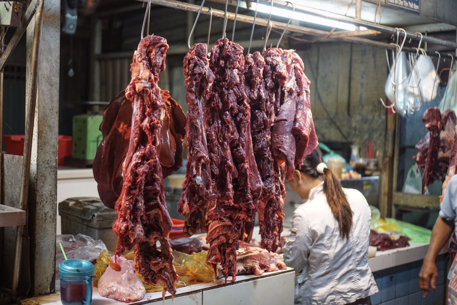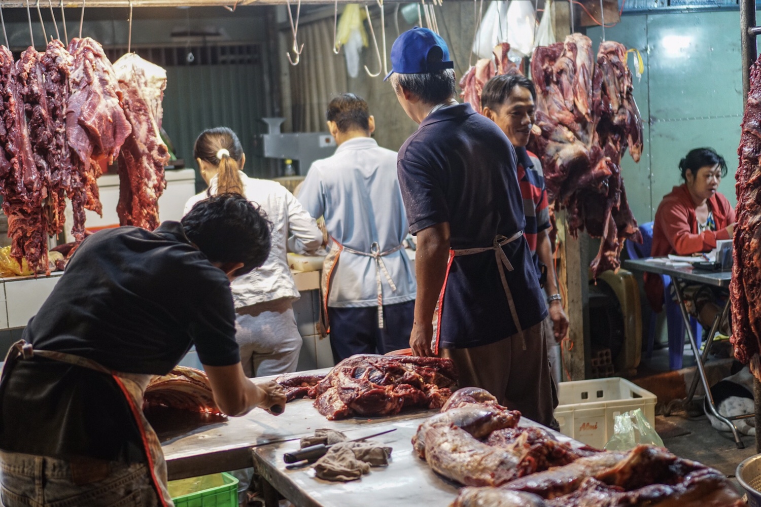 Durch einen engen Gang zwischen Baustelle und GeschĂ€fte erreichen wir die Markthalle. Alle Farben der Welt findet man hier in nur einem einzelnen Gang. HĂ€ndler schmiegen sich wie auf einer Messe dicht nebeneinander und buhlen um unsere Aufmerksamkeit. Es geht uns schon auf die Nerven, ist auf der anderen Seite dann aber doch lustig, wenn die Damen und Herren sofort aufhĂŒpfen, sobald sie einen potenziellen Kunden riechen. „Buy from me!“, „What are you looking for!?“, „Sir, can I help you, Sir?“, „T-shirt?“