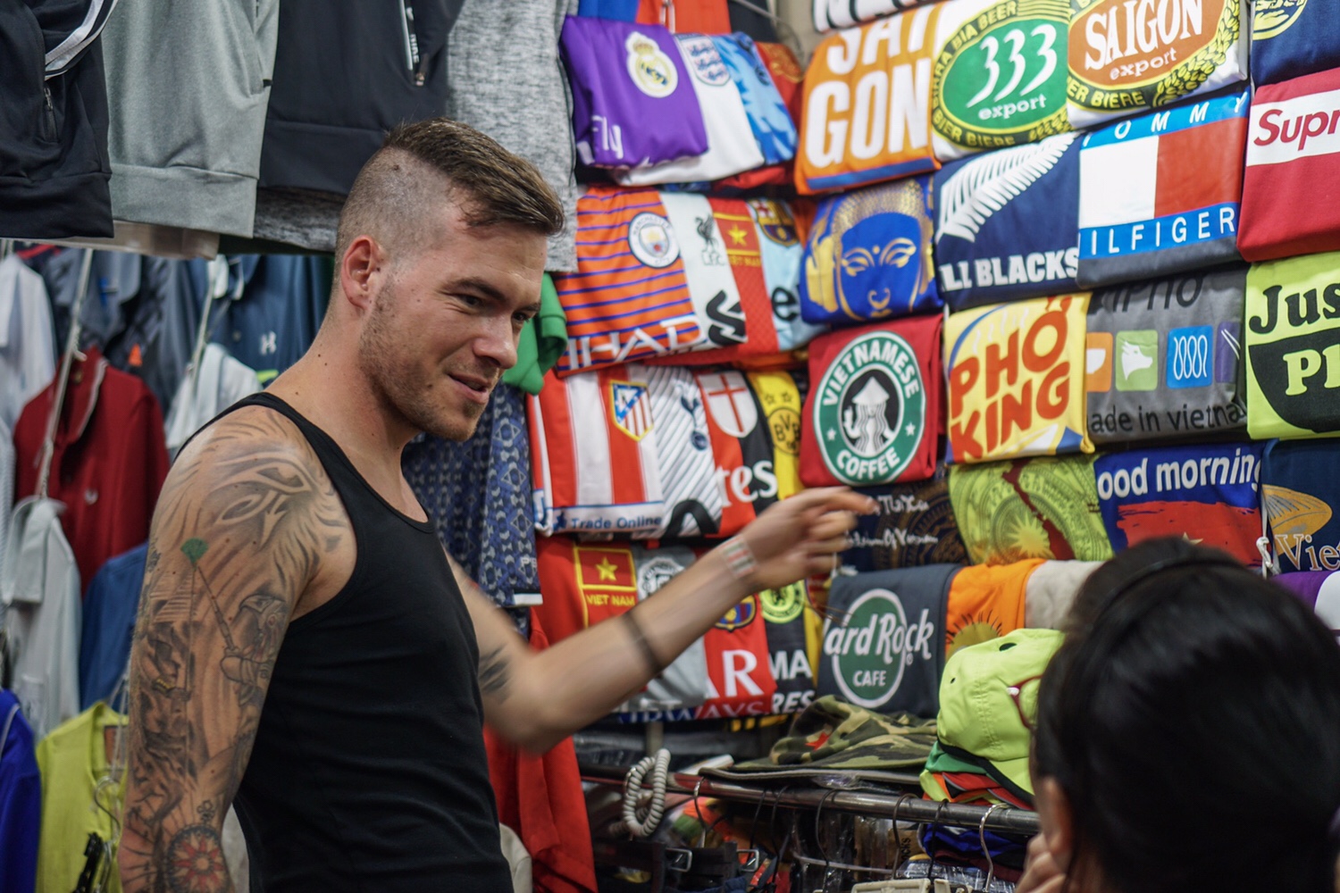 Kevin sucht schon seit ein paar Tagen einem AufnĂ€her der vietnamesischen Flagge der fĂŒnf Elemente. Leider wird er selbst auf diesem großen Markt nicht fĂŒndig. Vielleicht muss er genau so wie ich zuerst aufgeben, um dann das nichtmehr Gesuchte zu finden.