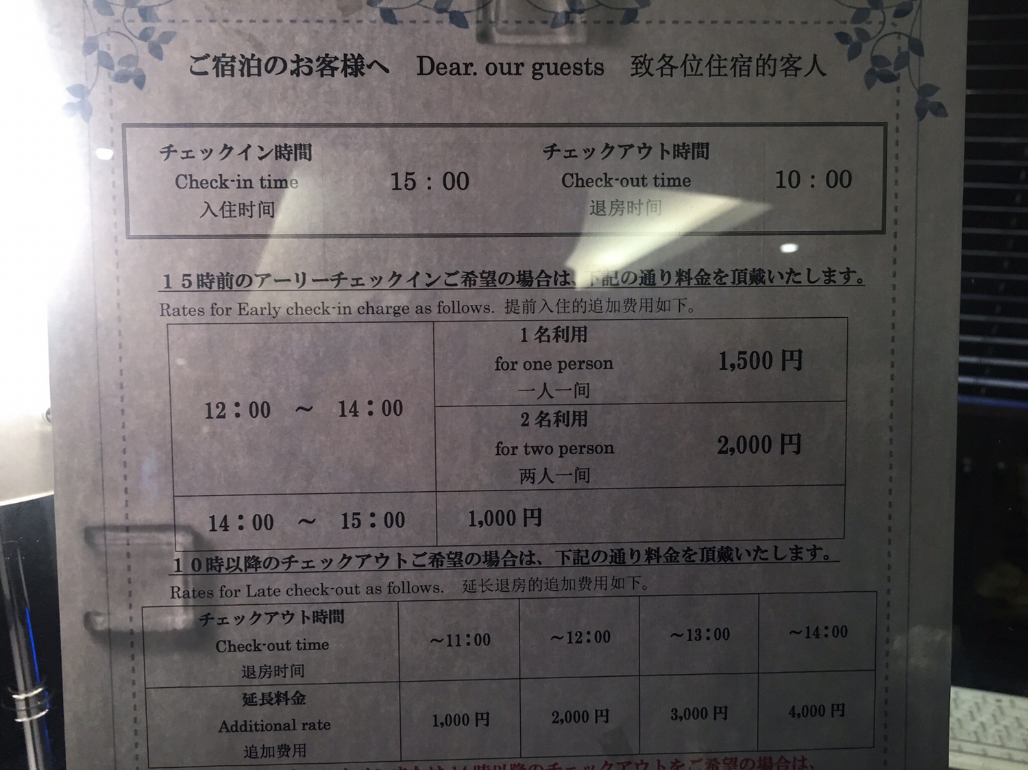 Dann gehe ich wieder ins Hotel, weil ich fragen möchte, ob unser Zimmer schon fertig ist. Die Belegschaft hat gewechselt und so meint nun der gute Herr, dass das Zimmer fertig sei und ich gerne einchecken kann. DOCH, wenn ich jetzt zwischen zwei und drei Uhr einchecke, muss ich eine GebĂŒhr von 1.000 Yen (circa sieben Euro) bezahlen. Ich frage, was das fĂŒr eine komische GebĂŒhr sein soll – mein Zimmer ist fertig und ich bin da! Wo ist das Problem?! „Tut mir leid, zwischen zwei und drei mĂŒssen Sie 1.000 Yen bezahlen. Kostenloser Check-In ist dann ab drei.“ Ich frage ihn noch einmal, was das fĂŒr einen Sinn hat, doch er kann es mir nicht verraten. Es ist halt so. Doch ich bezahle nicht, weil ich so einen Blödsinn nicht unterstĂŒtze. Ich sage ihm, dass ich die Stunde noch warte und sicher keinen Groschen fĂŒr einen Check-In bezahle.