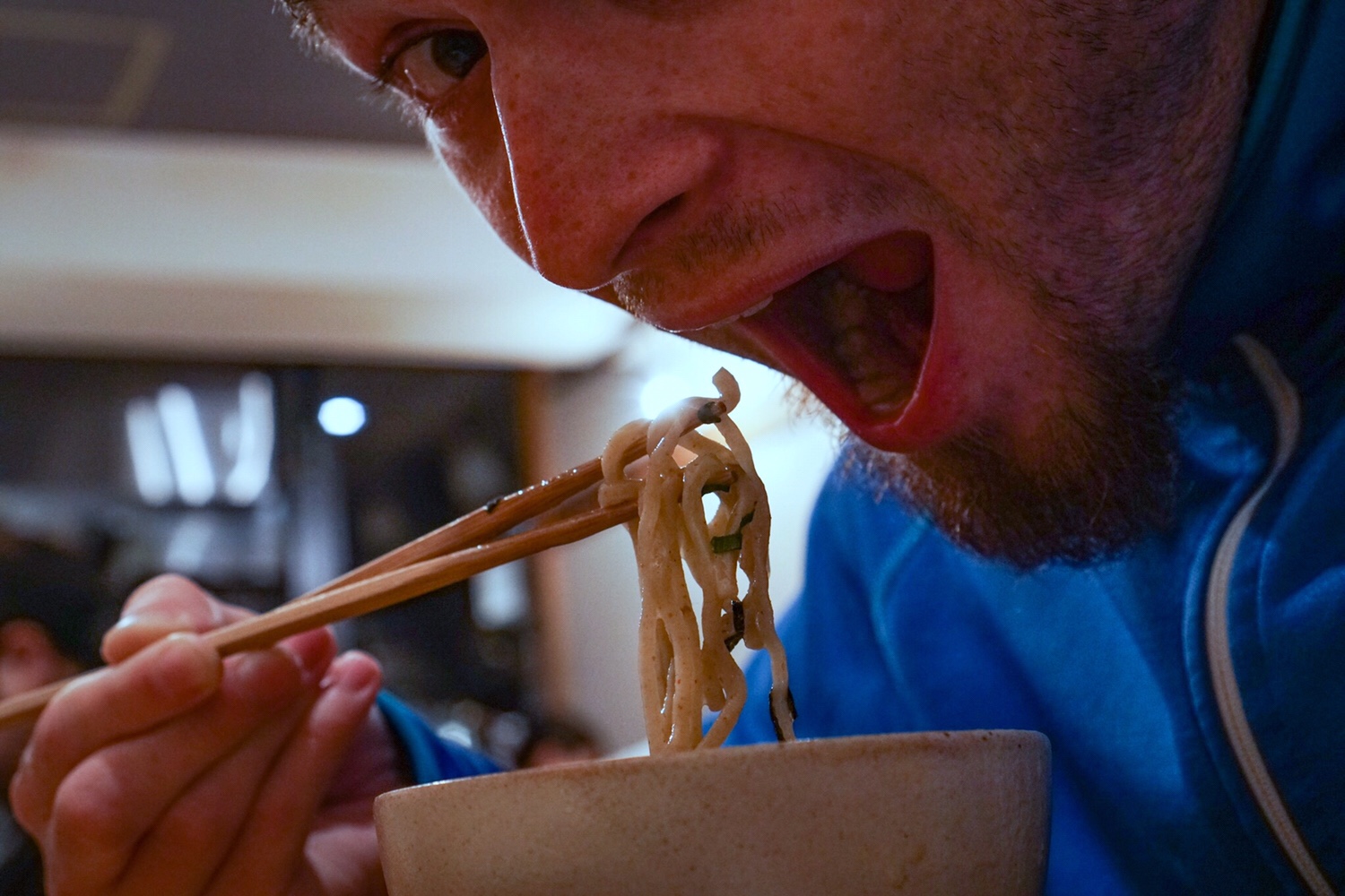 Ich brauche nur einmal kurz das Navi, bis dorthin war es aber wirklich einfach. Das „THANK“ ist ein winziges Lokal! Der Kellner sieht mich und merkt sofort, ich brauche Special Assistance. Er kann auch kaum Englisch, also zeige ich auf ein Bild der ĂŒberschaubaren, laminierten, einseitigen A4 Karte, die er mir vor die Nase hĂ€lt. Meine Bestellung und Bezahlung wickle ich gleich im Vorhinein bei einem Automaten neben dem Eingang ab. Der Raum ist drei Meter breit und – wenn ĂŒberhaupt – acht Meter lang. Ich sitze wie an einem Fensterbrett und schaue gegen die Wand. Die einzige Aussicht ist der Notfallschalter fĂŒr den Feueralarm. Neben mir schlĂŒrfen sie die Nudeln aus den großen SchĂŒsseln, aber das gehört sich hier so. Dann bringt auch er mir die SchĂŒsseln mit Ramen und eine zweite mit einer Sauce bzw. Suppe. Er deutet mir, dass ich die Nudeln dort eintunken muss. Als ich das dann so mache schmeckt’s auch wirklich sehr gut! Ich kann sagen, dass die Nudeln selbst die besten waren, die ich jemals gegessen habe! Nicht durchgekocht, nicht hart – schön mit Biss. Al dente eben. Vor der TĂŒre hat sich mittlerweile eine Schlange gebildet. So mache ich mich aus dem Staub, dass die anderen auch noch die tollen Nudeln genießen können.