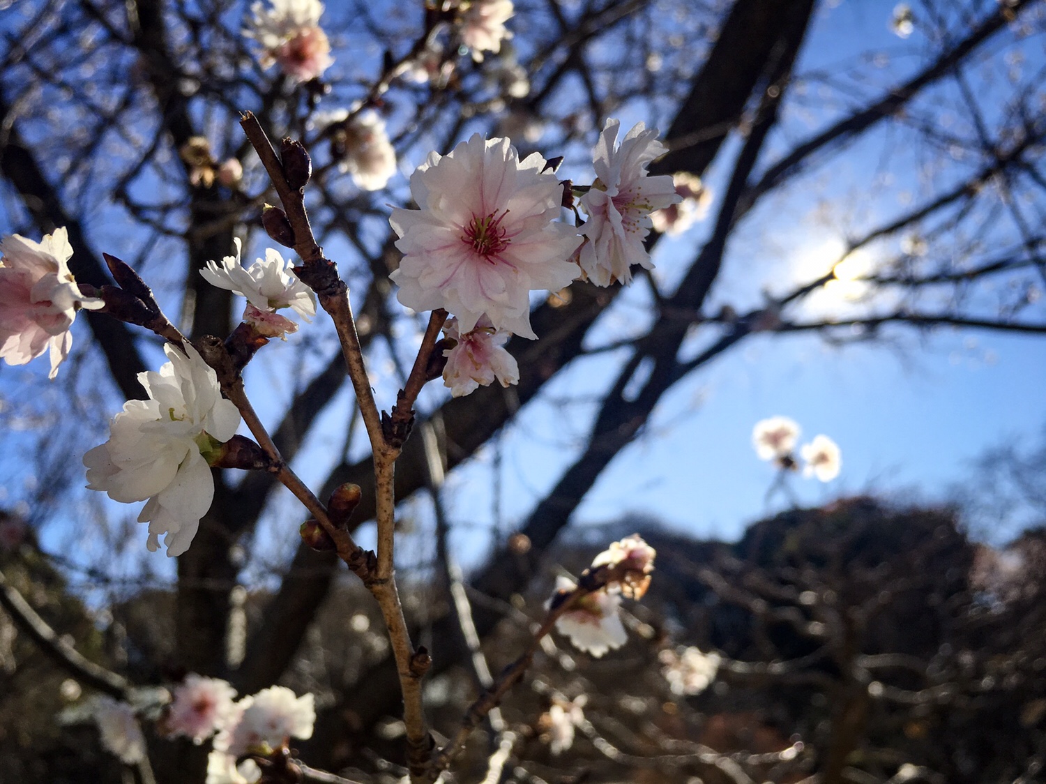 Die schön geschnittenen Bäume haben Strohmanschetten um den Stamm gewickelt, dass sie von Ungeziefer schützen soll. Yoshi erklärt uns, dass es Kirschbäume gibt, die nicht wie andere Arten im Frühjahr blühen, sondern jetzt im Winter. Als Beweis zeigt er uns einen Baum, dessen zart-rosa-farbigen Blüten im tristen Grau-Grün-Braun rundherum eigenartig aussieht.
