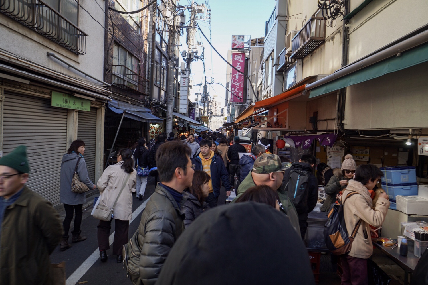 Einen kurzen Fußmarsch entfernt ist der größte Fischmarkt der Welt (sagt man). Möchte man die geschäftigen Auktionen von fangfrischem Fisch und Meeresfrüchten sehen, muss man schon äußerst zeitig kommen. Dafür sind wir viel zu spät dran und so führt uns Yoshi durch die angrenzenden engen Gassen mit vielen Ständen der Endkundenverkäufer, die mit vielen Schildern und Marktschreiern Kunden anwerben.