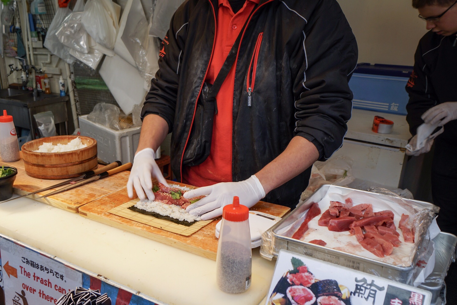Es gibt nicht nur Ware zum Weiterverarbeiten, sondern auch fertig zubereitetes Streetfood. Gleich beim Einbiegen in die erste Gasse kauft Sörs ein paar Stück Thunfischmaki. Sie werden vor unseren Augen frisch gerollt und geschnitten. Yoshi kümmert sich um die Bestellung und Zahlungsabwicklung.