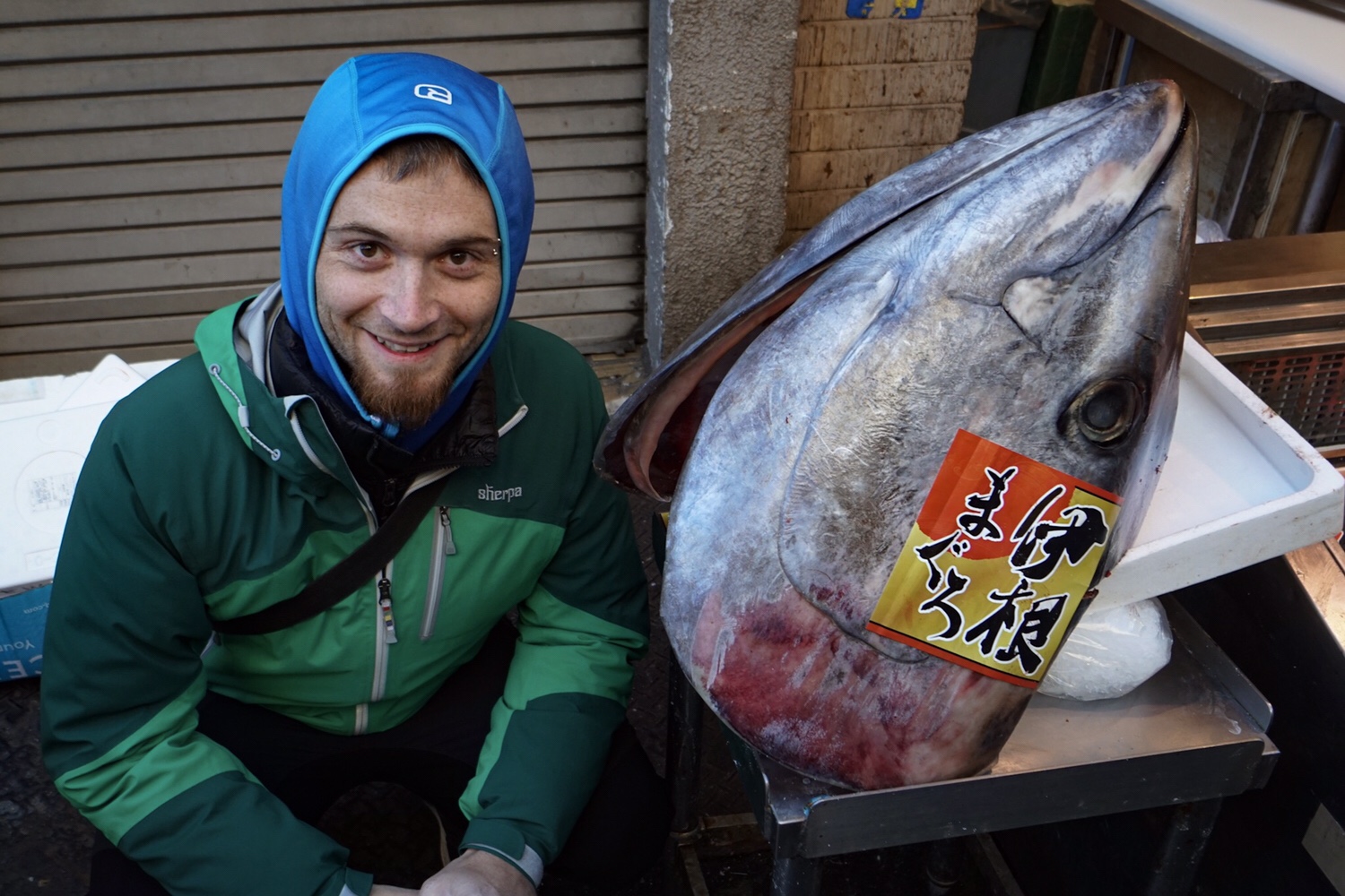 Dann gehen wir weiter im Getümmel. Es sind so viele Leute unterwegs, dass man eher geschoben wird. Stehenbleiben geht nur mit eiserner Entschlossenheit. Bei dem Tunfischkopf müssen wir allein schon zwecks Foto stoppen.