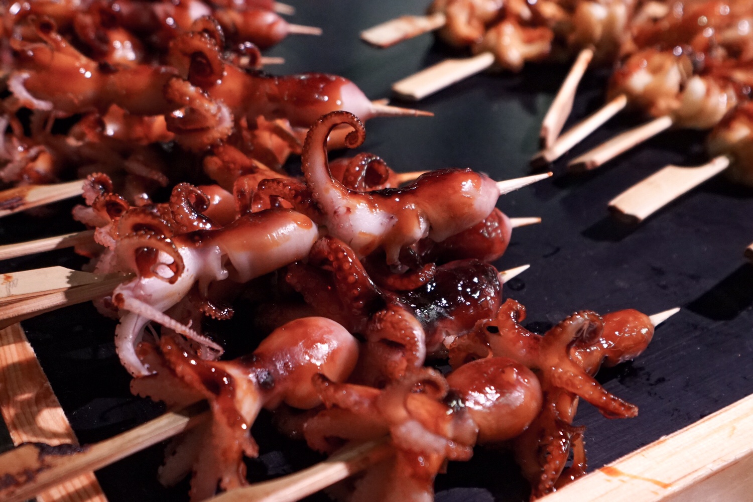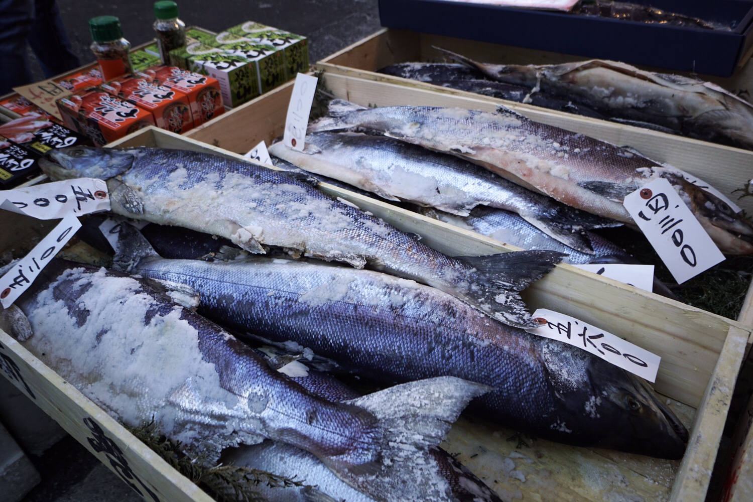 Von überall her kommen verschiedene Gerüche. Manchmal fischelt es extrem und dann wieder riecht es herrlich nach etwas frisch zubereitetem. An einem Stand werden wir neugierig, was denn alles angeboten wird. Verschiedene Spieße bestückt mit Tintenfisch, Lachs, Muschel oder Aal. Sörs und ich entscheiden uns für den Aal. Ist ein bisschen fett, aber wahrscheinlich deswegen nicht so schlecht. Eine kulinarische Weiterbildung.