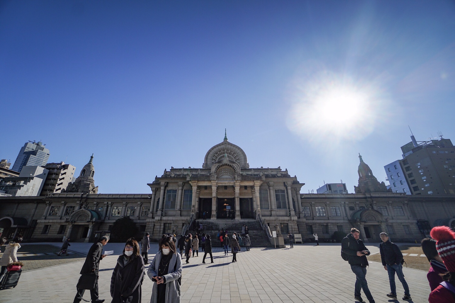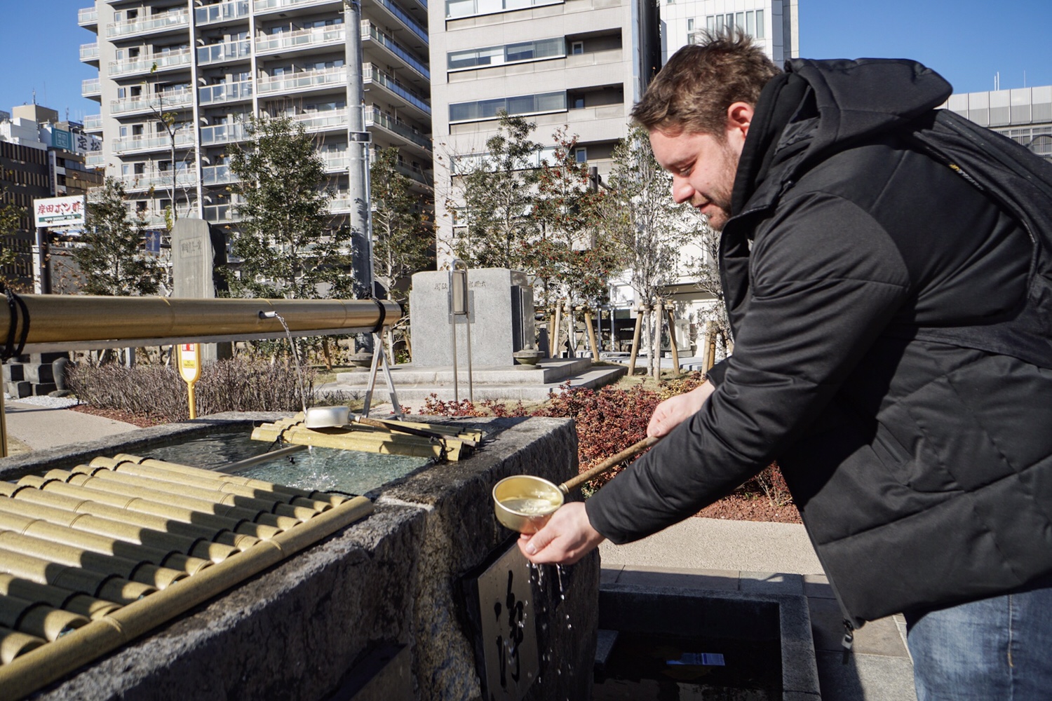 Ebenso nur einen Steinwurf entfernt steht der Tsukiji Hongwanji Tempel, der der indischen Baukunst nachempfunden wurde. Yoshi fragt uns, ob wir drinnen beten möchten. Wir meinen „Ja, warum nicht.“, doch davor müssen wir uns noch rituell reinigen. Vor dem Tempel steht ein Brunnen, von dem wir mit Kellen Wasser schöpfen und uns damit die Hände waschen, sowie den Mund ausspülen. Nun sind wir bereit für den Tempel.