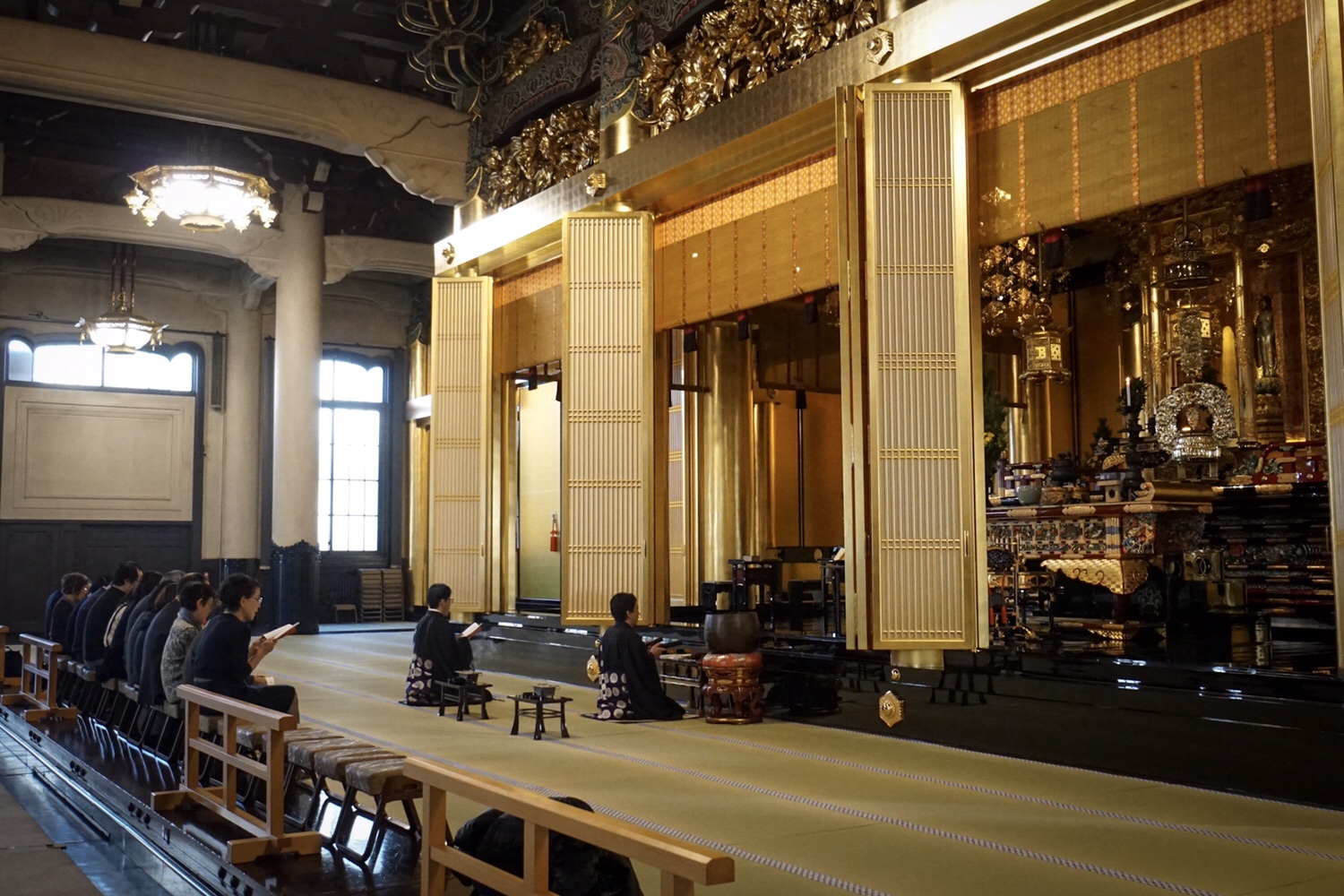 Drinnen riecht es nach Räucherstäbchen bzw. Weihrauch. Yoshi sagt uns, dass wir uns an dieser langen Schlange vor uns anstellen müssen, um dann selbst für ein paar Sekunden beten zu können. Nachdem Sörs und ich die Schlange sehen, lassen wir das lieber aus. So führt uns Yoshi nach vorne, in die erste Reihe. Vor dem Schrein beginnt gerade eine Zeremonie. Uns wird erklärt, dass es sich um eine Trauerfeier handelt, bei der die Angehörigen gemeinsam mit Mönchen für den Verstorbenen beten.