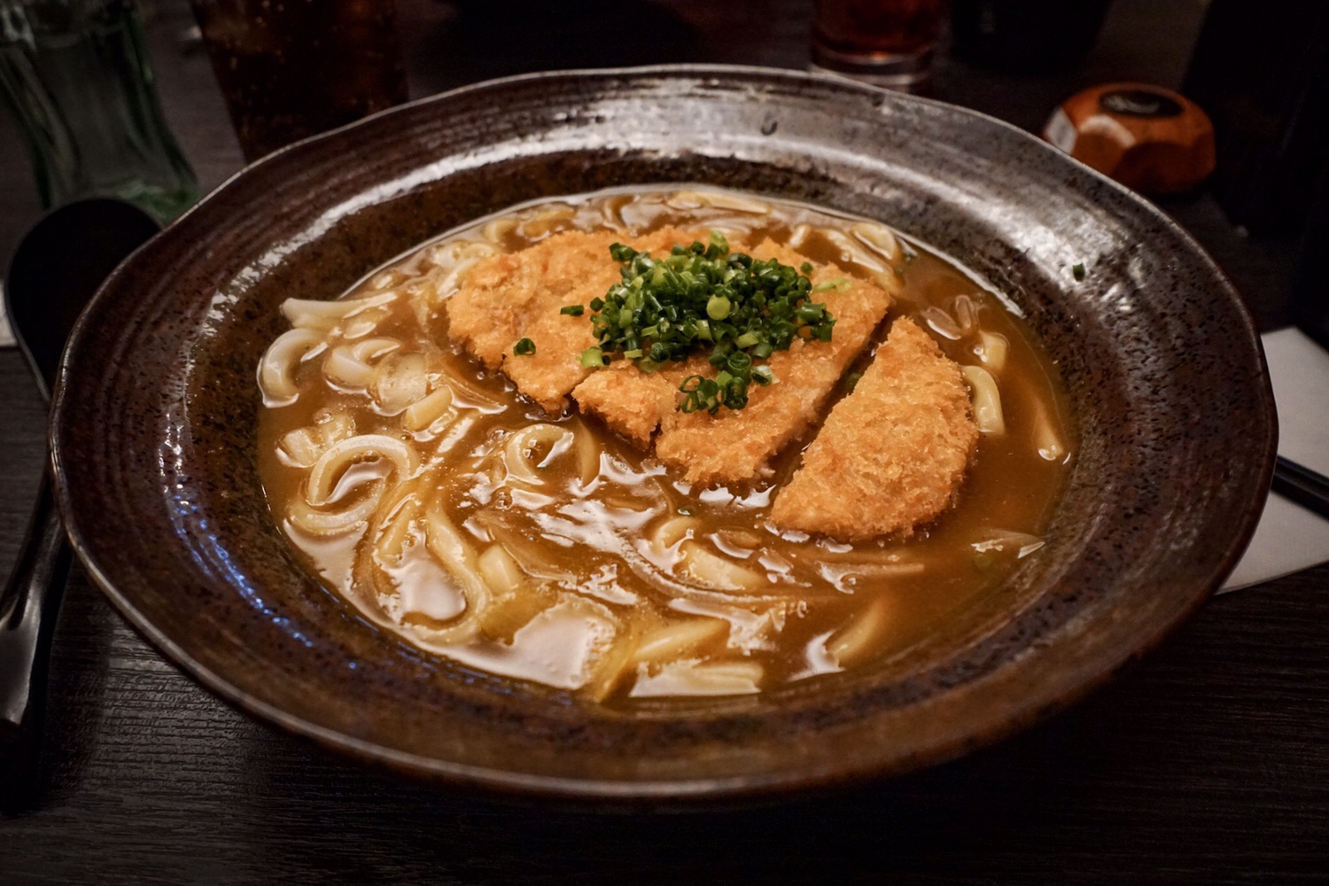 Yoshi bestellt Udon in Currysauce mit Rindfleisch, Sörs entscheidet sich für klassische Udon in klarer Suppe mit Rindfleischeinlage und ich wähle ebenso Udon in Currysauce mit panierter Hühnerbrust.