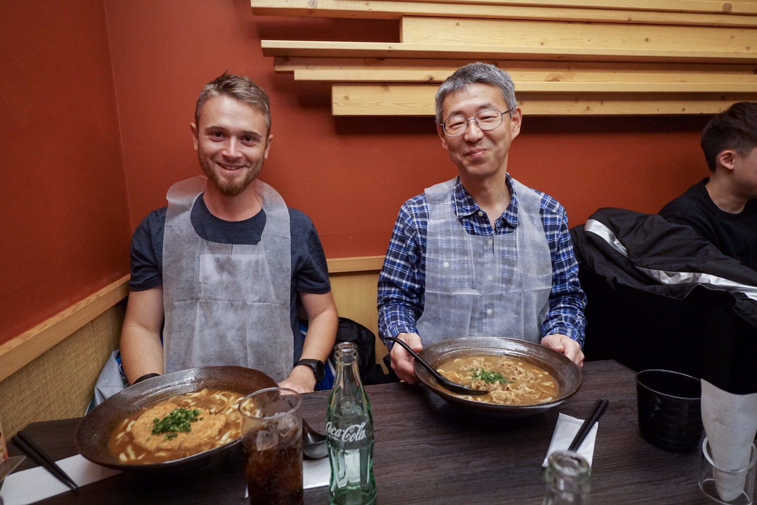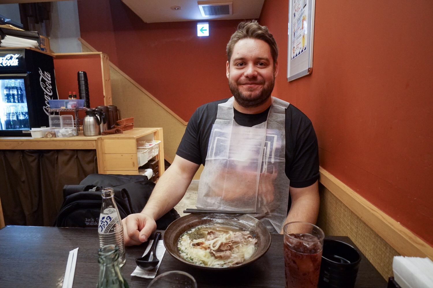 Bevor wir mit dem Essen starten, binden wir uns einen Latz für Erwachsene um. Schaut lustig aus, ist aber sehr wichtig, wenn man Udon isst. Die dicken Nudeln spritzen wie Kinder im Planschbecken, wenn man sie aus der Schüssel schlürft, oder sie wegen Tollpatschigkeit durch die Stäbchen zurück in die Sauce rutschen lässt.