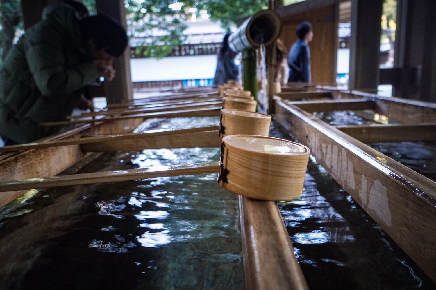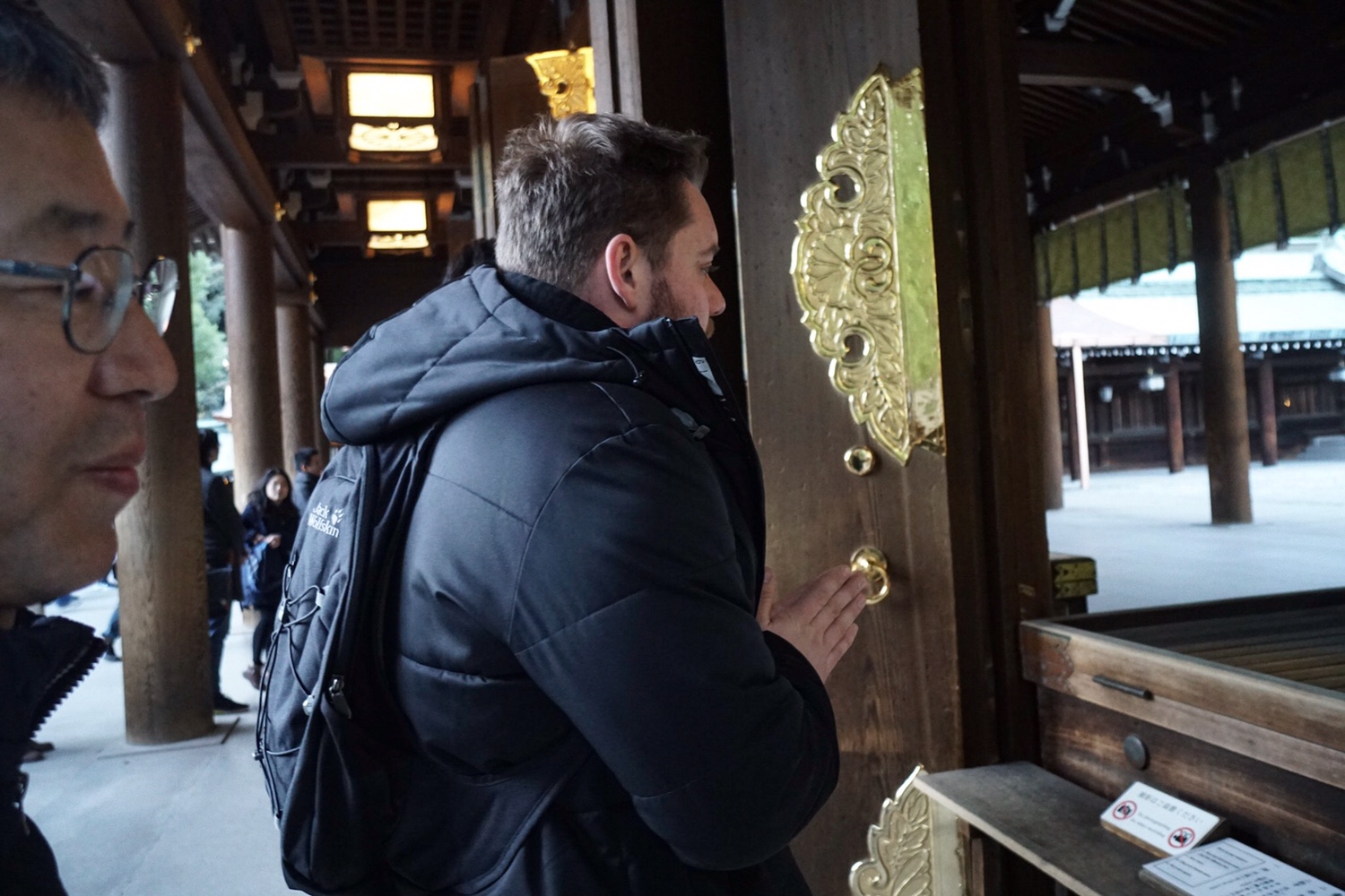 Hier wagt Sörs einen neuen Versuch zu beten. Er und Yoshi waschen sich, wie wir es schon gelernt haben. Ich muss leider auslassen, da mir vom kalten Wasser sonst die Finger einfrieren würden. Yoshi zeigt ihm, wie man richtig vorgeht. Zuerst schupft man eine Münze zwischen die vielen Schlitze vor dem Schrein. Dann muss er sich zweimal verbeugen, zweimal klatschen und kann dann mit gefalteten Händen beten. Zum Abschluss verbeugt man sich noch einmal. Gut gemacht, Sörs! Ich hab‘ keinen Fehler gesehen.