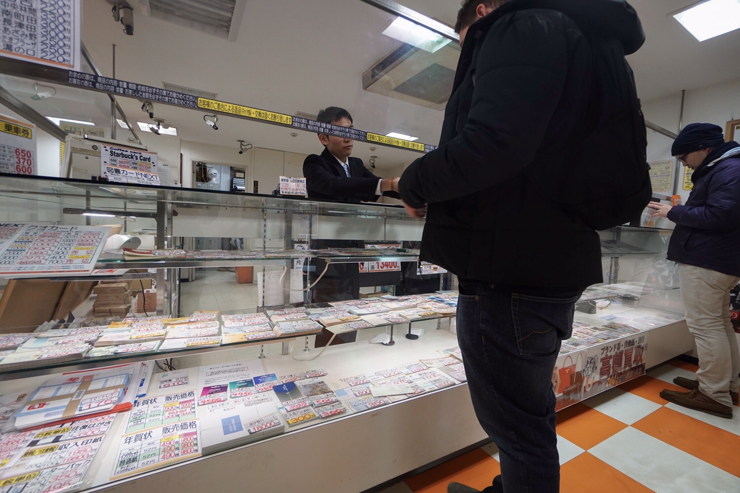 Einmal haben wir jetzt noch die Chance, mit Yoshis Hilfe ein Ticket für den Shinkansen Zug nach Kyoto zu kaufen. Er geht mit uns zu einem Ticketdiskonter, der Restbestände verkauft. Hier kaufen wir ein Hin- und Retourticket inklusive Sitzplatzreservierung unter dem Regulärpreis eines Tickets ohne Reservierung. Hoffentlich sind das gültige Tickets, die wir da gekauft haben.