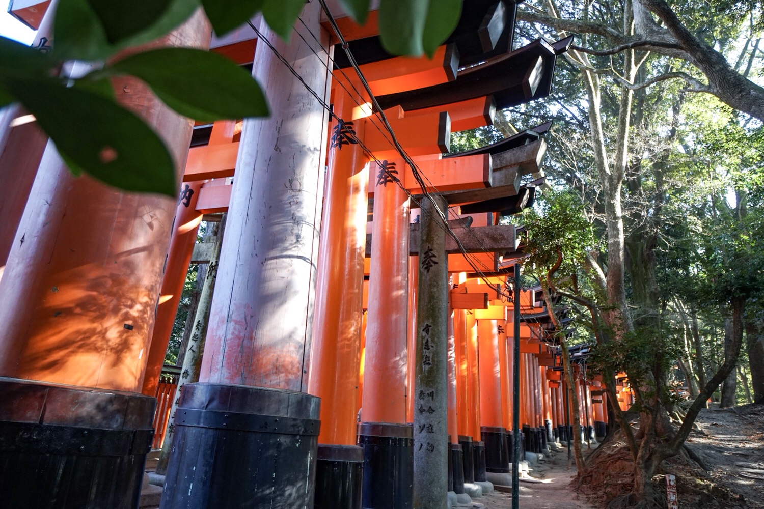 Die Wege, die sich durch den Wald schlängeln, sind mit dicht aneinandergereihten Toriis übertunnelt. Die Toriis können gekauft bzw. in Auftrag gegeben werden. Einige Firmen machen das, um dem Unternehmen Glück und Erfolg zu bringen. Doch auch Einzelpersonen und Familien haben hier schon in welche investiert. Es ist eine Frage des Geldes, wie groß das Torii sein soll. Das kleinste kostet umgerechnet circa 12.000 Euro. Sörs und ich werden heute keines aufstellen lassen.