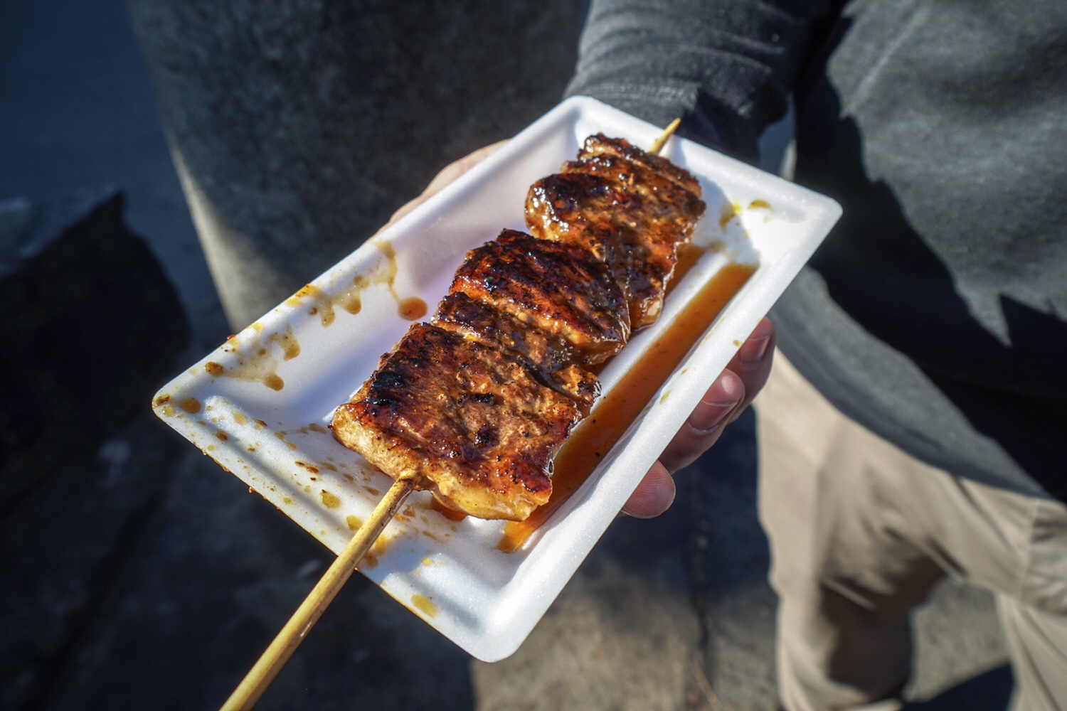 Wir kommen wieder zum Ausgangspunkt unserer Schreinbesichtigung. In einer Seitengasse, neben dem Eingang, gibt es Streetfood-Stände mit allerhand frisch zubereiteten, japanischen Gerichten. Essen ist wichtig! Wenn wir schon mal hier sind, dann probieren wir auch etwas aus. Die Spieße mit Schweinefleisch lachen uns an und der Verkäufer darf schon für jeden einen herrichten und in Bratensauce tunken.