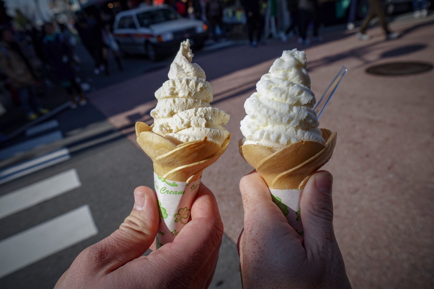 Auf die Nudeln mit Salat und Hühnerfleisch wird Mayonese gegeben und zum Schluss kommen noch Bonitoflocken (Katsuobushi) drüber. Geschmacklich bin ich nun zufrieden, Sörs nicht so ganz. Dafür gibt es jetzt ein Eis! Sörs nimmt eines aus Sojamilch mit Karamell und ich ein Sake-Eis. Auch beides gut!