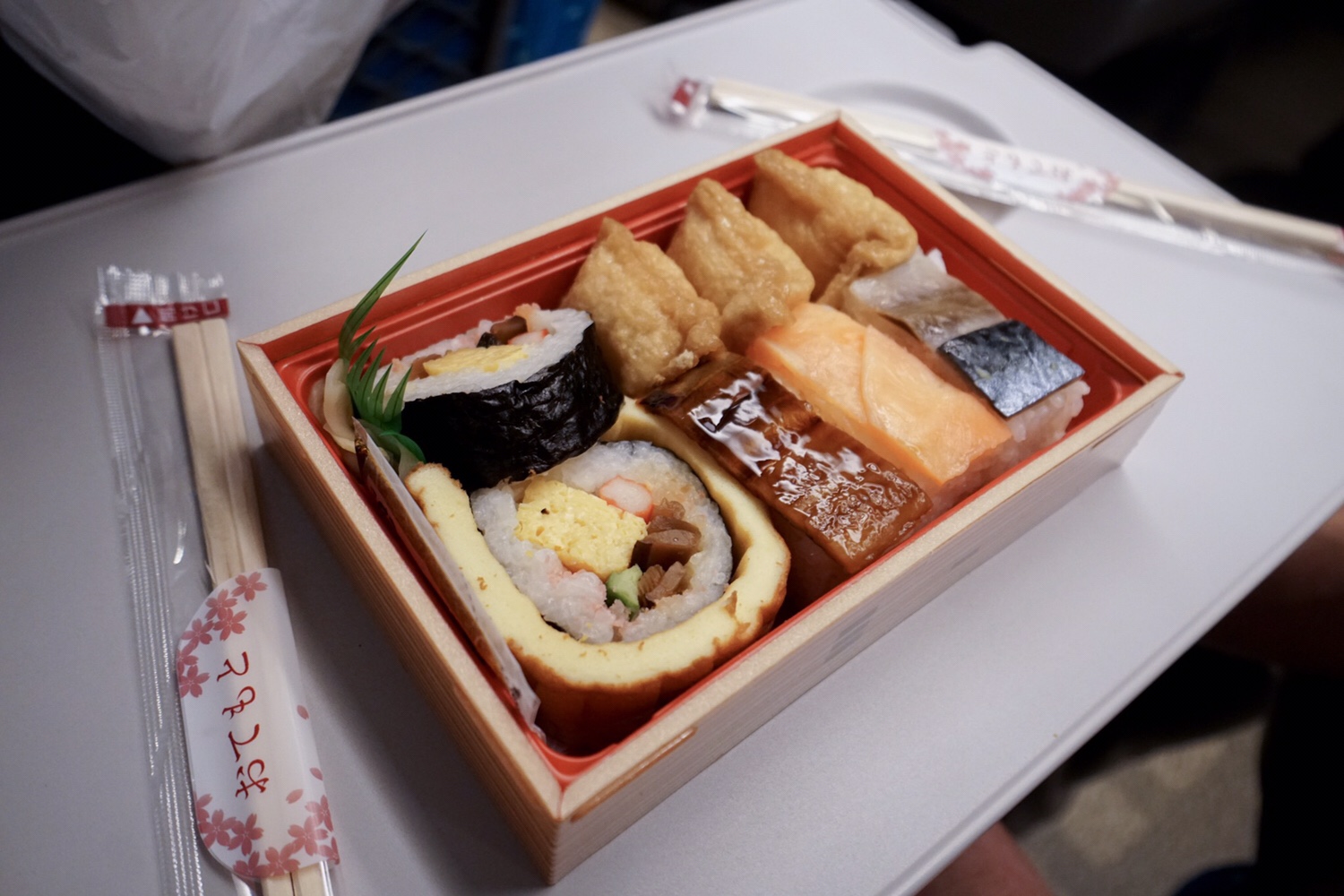 Wäre fliegen so angenehm wie Shinkansen fahren, dann wären längere Strecken auch kein Problem mehr für mich. Im Zug packen Sörs und ich unsere kürzlich gekauften Lunchboxen aus. Er hat eine gemischte Box mit allerlei und ich Sandwiches mit Hendlfleisch. Beides schmeckt sehr gut!
