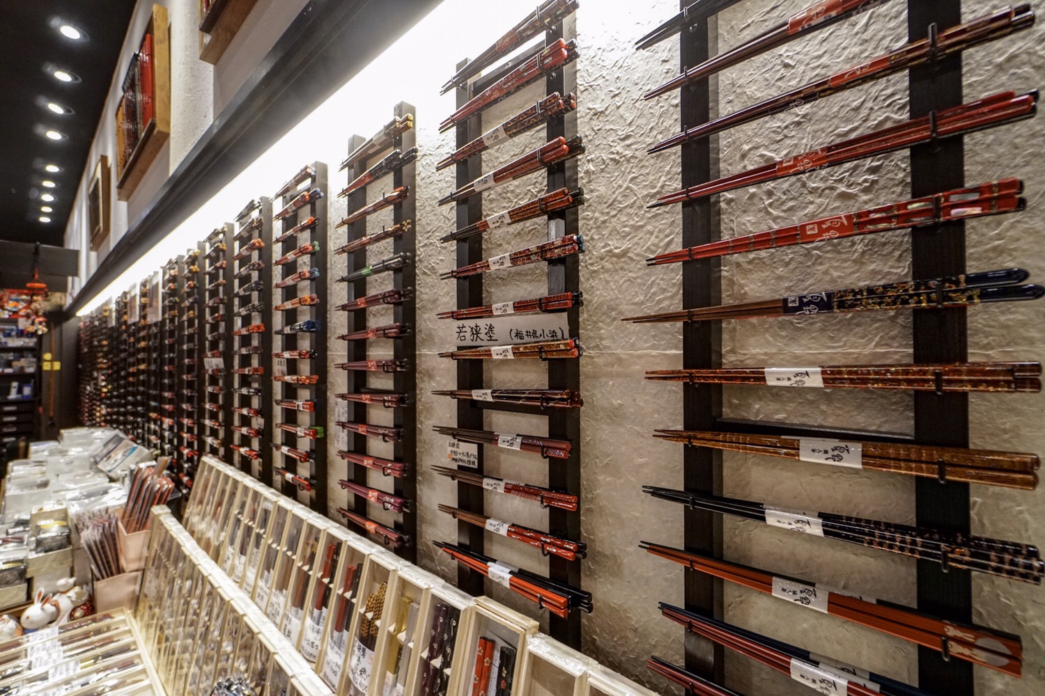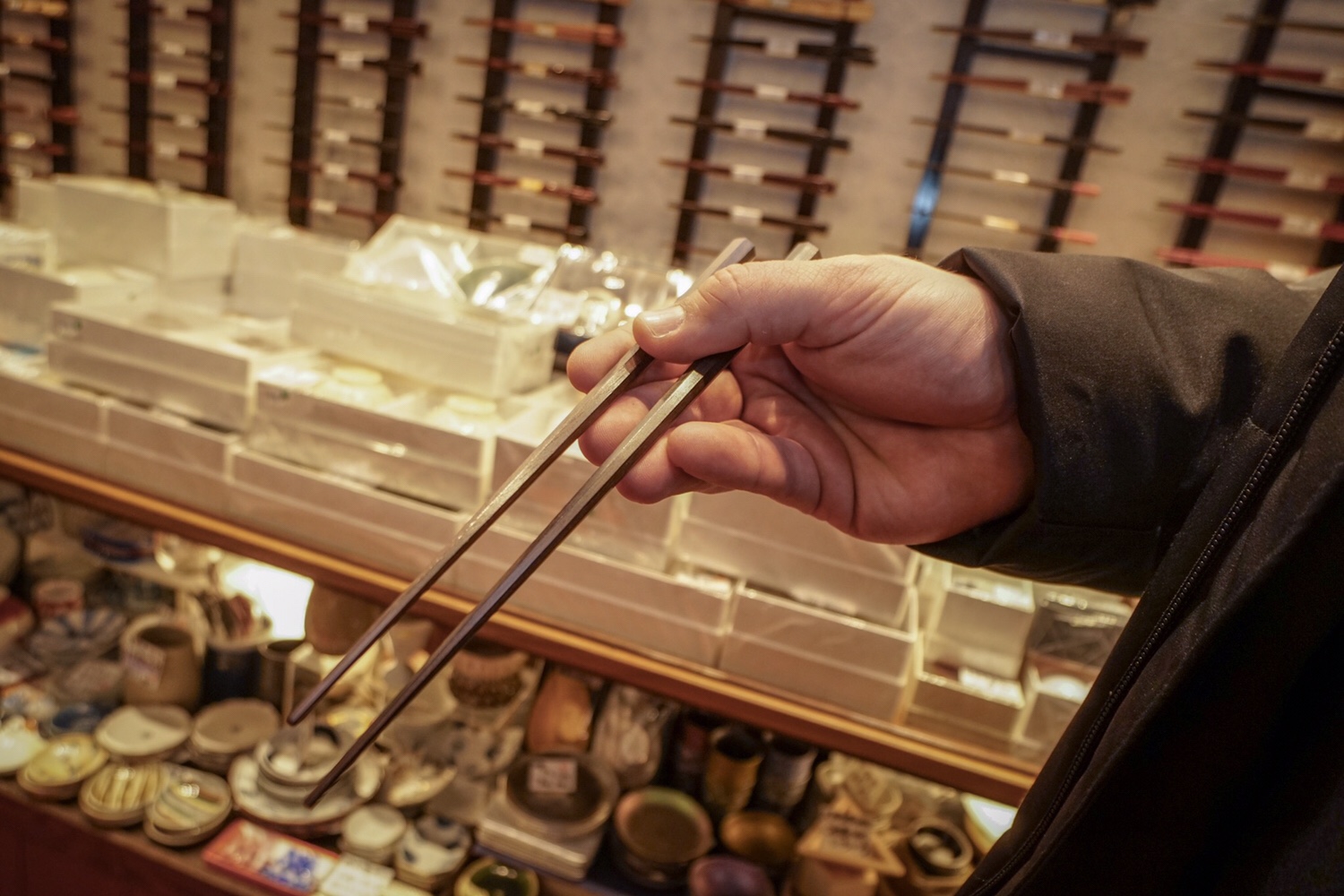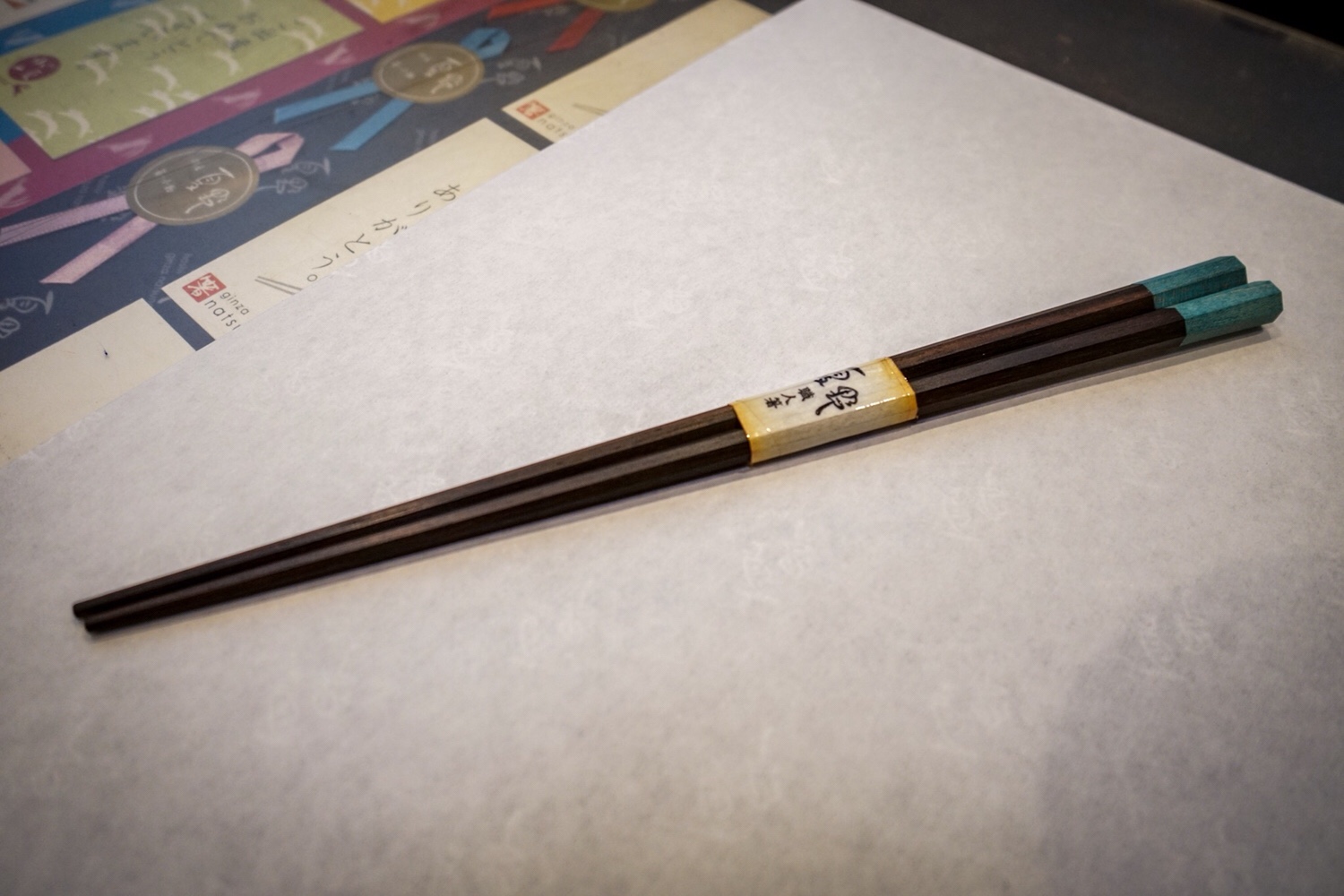 Ich frage die Verkäuferin, wo die teuersten Stäbchen liegen und sie deutet auf eine versperrte Kiste. Ich geh‘ die zwei Schritte dort hin und muss zweimal hinschauen. 250.000 Yen für das teuerste Paar in der Glaskiste – das sind umgerechnet fast 3.000 Euro. Ohne Steuer! Die kommt dann noch dazu. Plötzlich kommt mir der Preis meiner wie ein Schnäppchen vor.