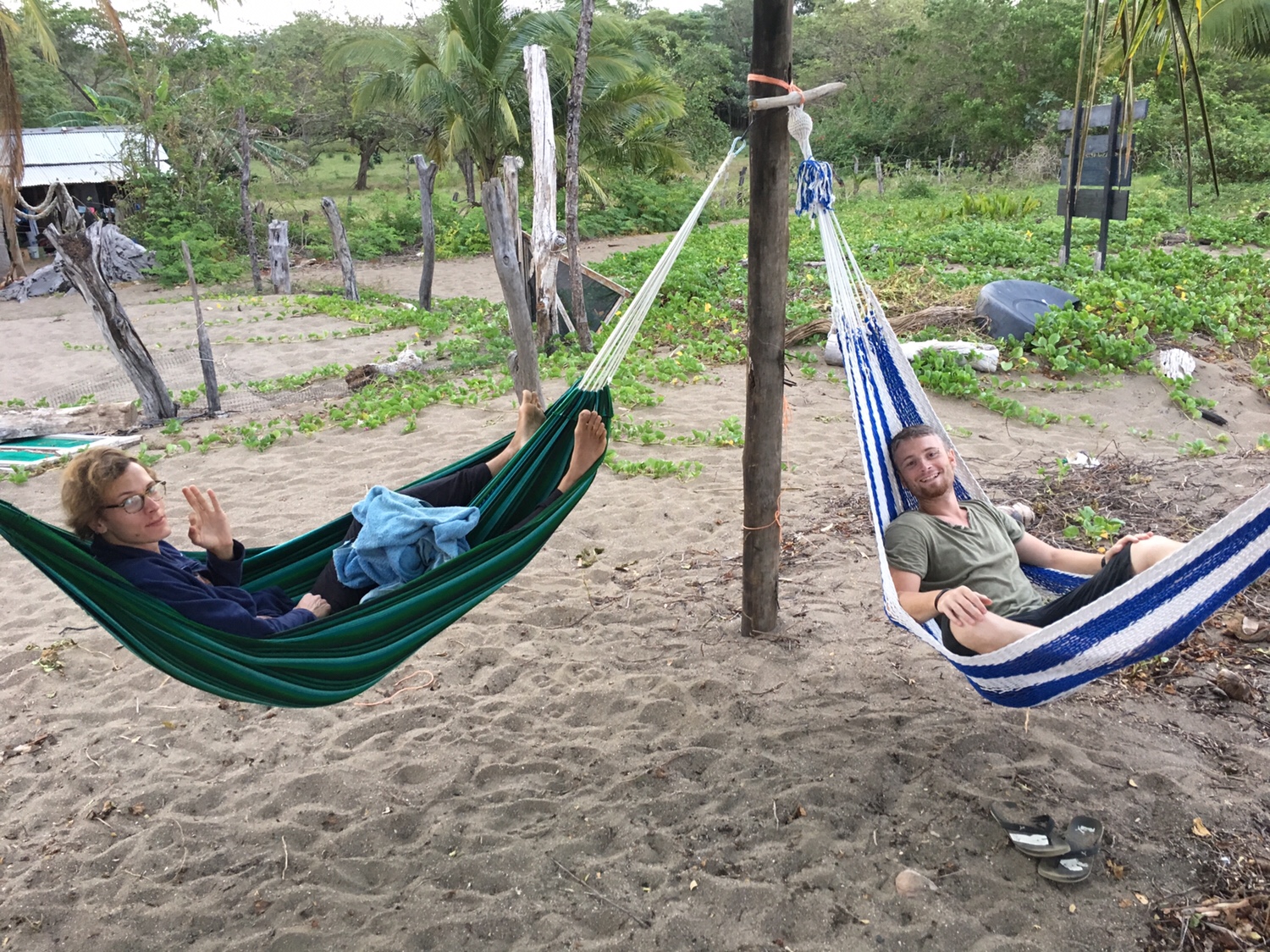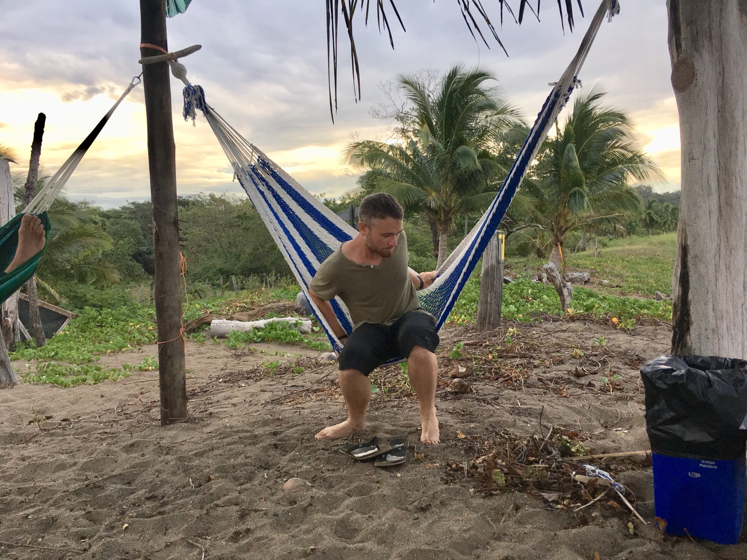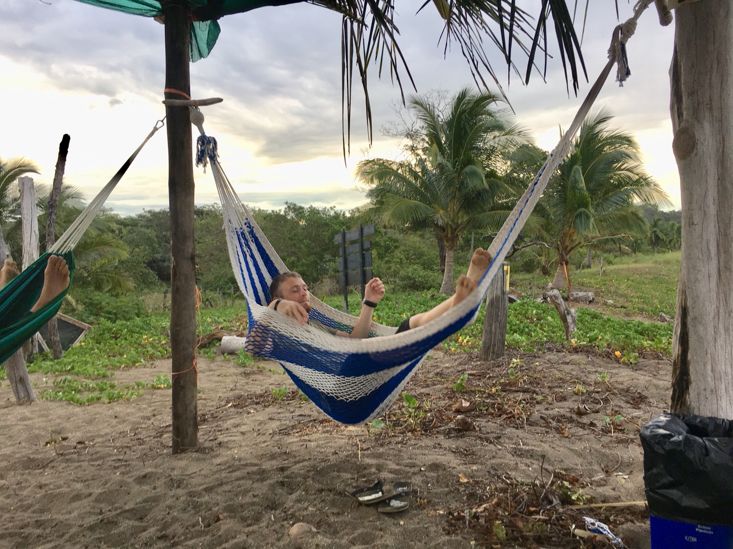 Als die fünf weg sind, kommt Daniel zu mir und wir haben seichten Smalltalk. Ich kann leider kein Spanisch und er kann nicht so gut Englisch. So bin ich bald wieder alleine und kann den jetzigen Beitrag finalisieren. Dom und Safira liegen neben mir und sorgen dafür, dass die Kühe, die vom Gehege hinter dem Camp ausgebrochen sind und jetzt auf der Vorderseite grasen, nicht zu nahe kommen. Während ich hier liege, habe ich nicht einmal mitbekommen, dass Daniel die Brutstätte in seiner Drei-Stunden-Schicht gecheckt hätte. Ich hoffe, er ist ein bisschen engagierter. Viel mehr wünsche ich mir, dass wir morgen nach Samara gehen dürfen. Ich muss unbedingt eine Schnur kaufen, sonst wird‘s mit dem Sessel wirklich nix mehr. Außerdem hätte ich wieder gerne Pizza, weil wir im Camp nichts aus Teig bekommen. Dazu kommt, dass mein Gummibärenvorrat absolut erschöpft ist. Wie soll man so zum Schildkrötenerhalt beitragen?!