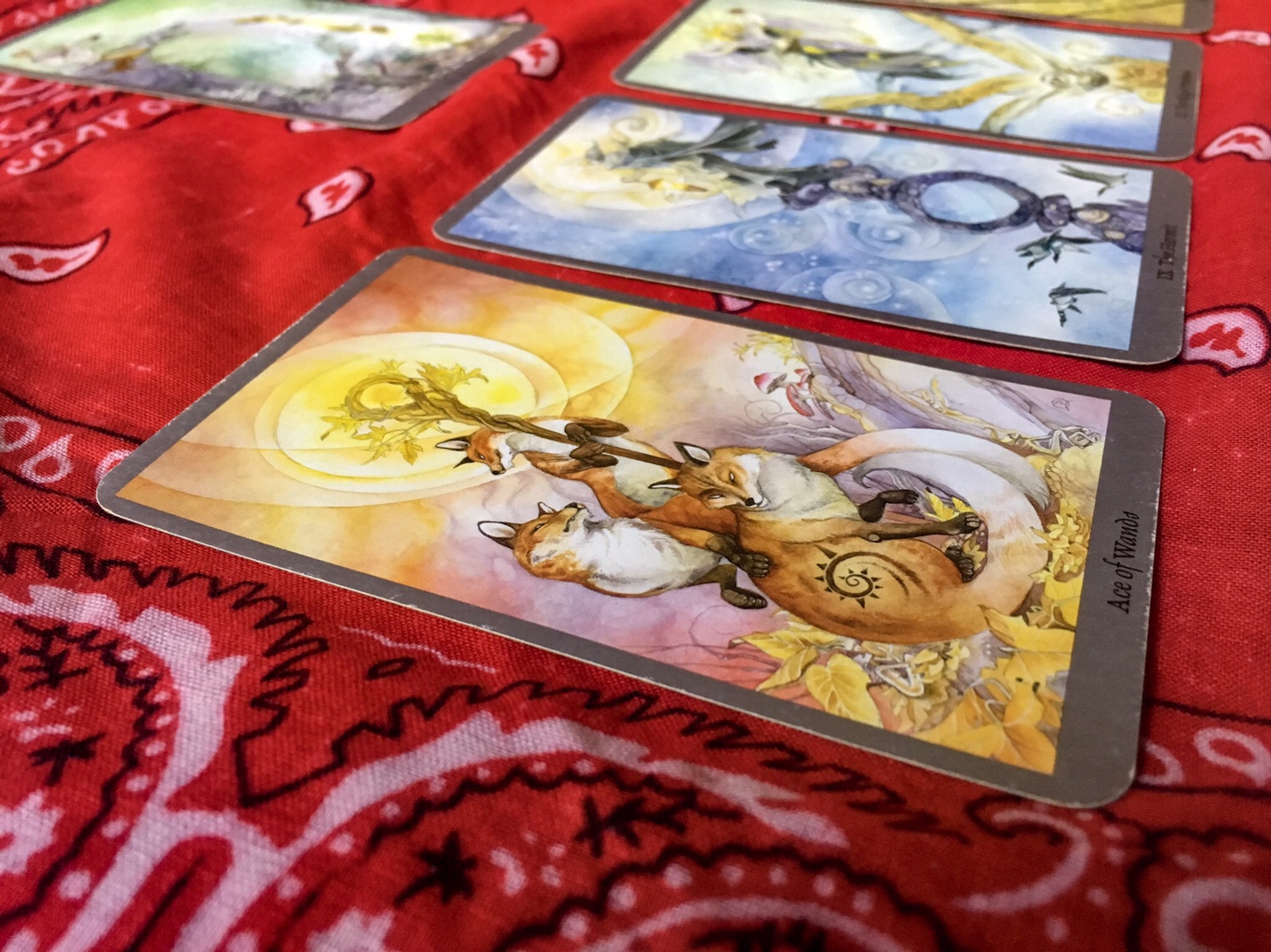 Mati hat vor sich ein rotes Tuch ausgebreitet, worauf er einen Kartenstapel legt. Ich muss den Stapel dritteln, wonach Mati die einzelnen Stapel wieder zusammenlegt und ein letztes Mal mischt. Er beginnt drei Reihen von Karten zu legen, die meine Vorschau für das Jahr 2018 werden sollen. In der ersten und auch in der letzten Reihe liegt jeweils nur eine einzige Karte. Die obere Karte ist wie die Überschrift bzw. das Grundthema zu deuten und die untere Karte beschriebt die allgemeine Kraft, die hinter jeder der vier Karten steckt, die er in der mittleren Reihe aufgelegt hat. Diese vier Karten stehen für die Quartale des Jahres. Ich werde nicht auf jede seiner Deutungen näher eingehen, aber ich verrate, dass der positive Tenor, der hinter allen Karten steckt, eine gute Aussicht ist! Ich muss sagen, dass Mati das sehr gut gemacht und sich unheimlich viel Wissen über die Deutung jeder einzelnen Karte angeeignet hat, sowie Mythologien, die in einigen Kartenbildern miteingebaut sind, ordentlich studiert haben muss. Es war eine total interessante Erfahrung. Mati bietet mir an, dass wir in den nächsten Tagen gerne noch eine Session machen können, in der ich spezifische Fragen stellen kann, dessen Antworten er dann mittels Karten deutet. Vielleicht komme ich darauf zurück.