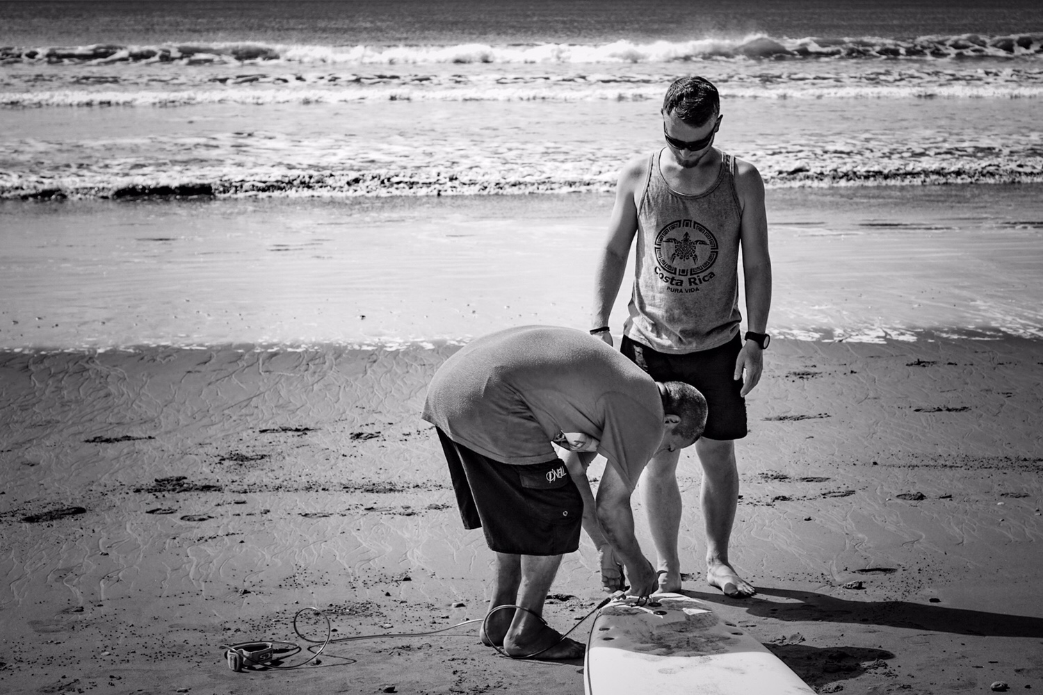 Das wird es auch. Roy hat heute Zeit für die Surfstunden. Das bedeutet, Surfbrett schnappen uns runter zum Strand. Zu allererst sagt er mir, was alles zu überprüfen ist, wenn man sich ein Surfbrett ausborgt. Dann folgen Infos, wie z.B. „niemals allein surfen gehen“ oder „sich über Strömungen und Gezeiten bei den Einheimischen informieren“. Nun macht er mit mir Trockenübungen. Dabei liegt das Brett am Strand und ich muss erst einmal lernen, wie man korrekt darauf liegt und dann die richtigen Bewegungen beim Aufstehen macht. Das wiederholen wir mehrmals und anschließend meint Roy, wir gehen gleich ins Wasser.