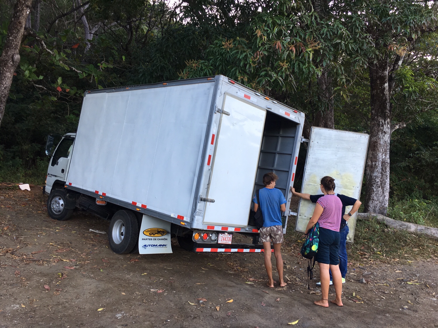 Ich bin dran, den Abwasch zu erledigen. Da ich gestern den Boden in den Schlafräumen nicht gekehrt habe, nehme ich Lottie diese Arbeit heute ab. Dazu kommt noch Klo putzen, das heute sowieso meine Aufgabe gewesen wäre. Bis zum Mittagessen hau ich mich noch eineinhalb Stunden auf‘s Ohr. In der Zwischenzeit geht Mati ans Ende des Strandes, um Trinkwasser von einem Hahn, der an die allgemeine Wasserversorgung angeschlossen ist, nachrinnen zu lassen. Das dauert eine Weile. Ich bin doch schon früher wieder aufgestanden, weil ich eh nicht ordentlich schlafen kann und so bekommen Lottie und ich die Aufgabe, Roy entgegen zu gehen, der gerade vom Fluss her kommt. Er war in Samara und hat Fleisch und Eiswürfel gekauft. Sein Freund, der hier öfter zum Surfen herkommt, isst heute gemeinsam mit seiner Freundin auch bei uns. Sie haben uns auch beim Tragen geholfen und schneiden Gemüse für das Mittagessen.