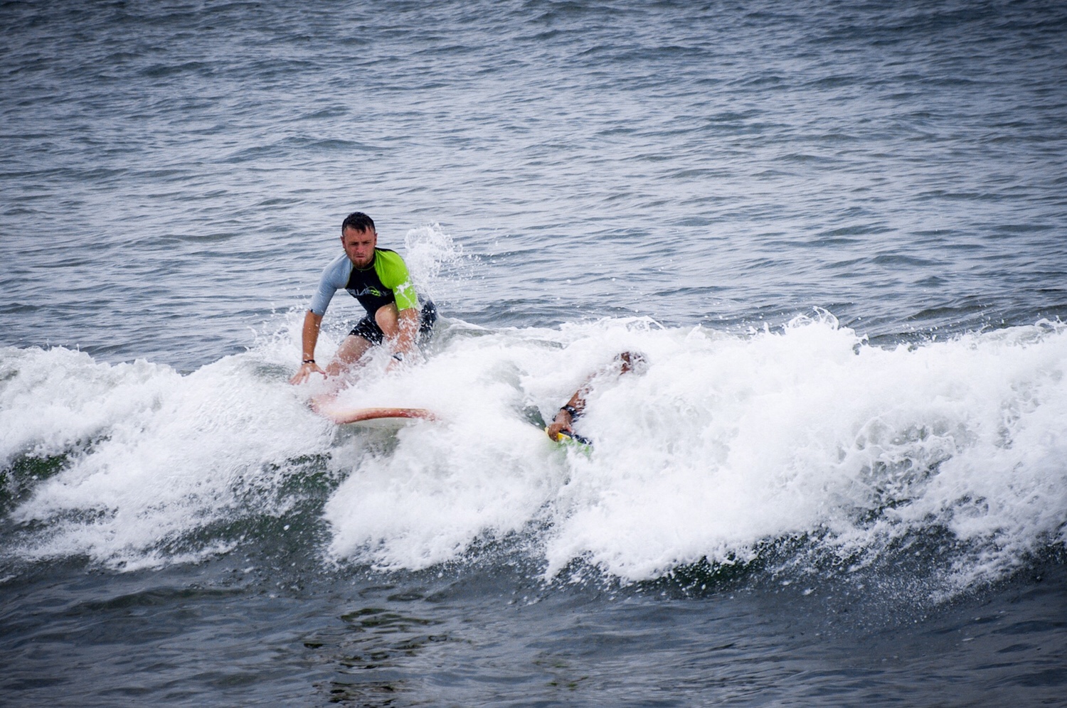 Dass es hier sehr seicht ist und einige Meter so ins Meer rein geht, hilft beim Aufsteigen auf‘s Brett und beim Rausschleppen sehr. Nun meint Roy, ich muss jetzt alles nach der Reihe machen, wie er mir das gerade gezeigt hat. Und entspannt soll ich bleiben, das sei sehr wichtig. Nagut, so warten wir auf die erste kleine Welle. Ich gehe in „Ready“-Position und Roy schiebt beim Anrollen der Welle von hinten das Brett mit an. Ich stehe auf und es geht auch einige Meter gut. Dann aber wirft mich das Brett ab. Noch einmal … und noch einmal. Immer wieder machen wir die gleichen Schritte und es wird in kurzer Zeit viel besser. Einmal schaffe ich es sogar, bis an den Strand zu surfen.