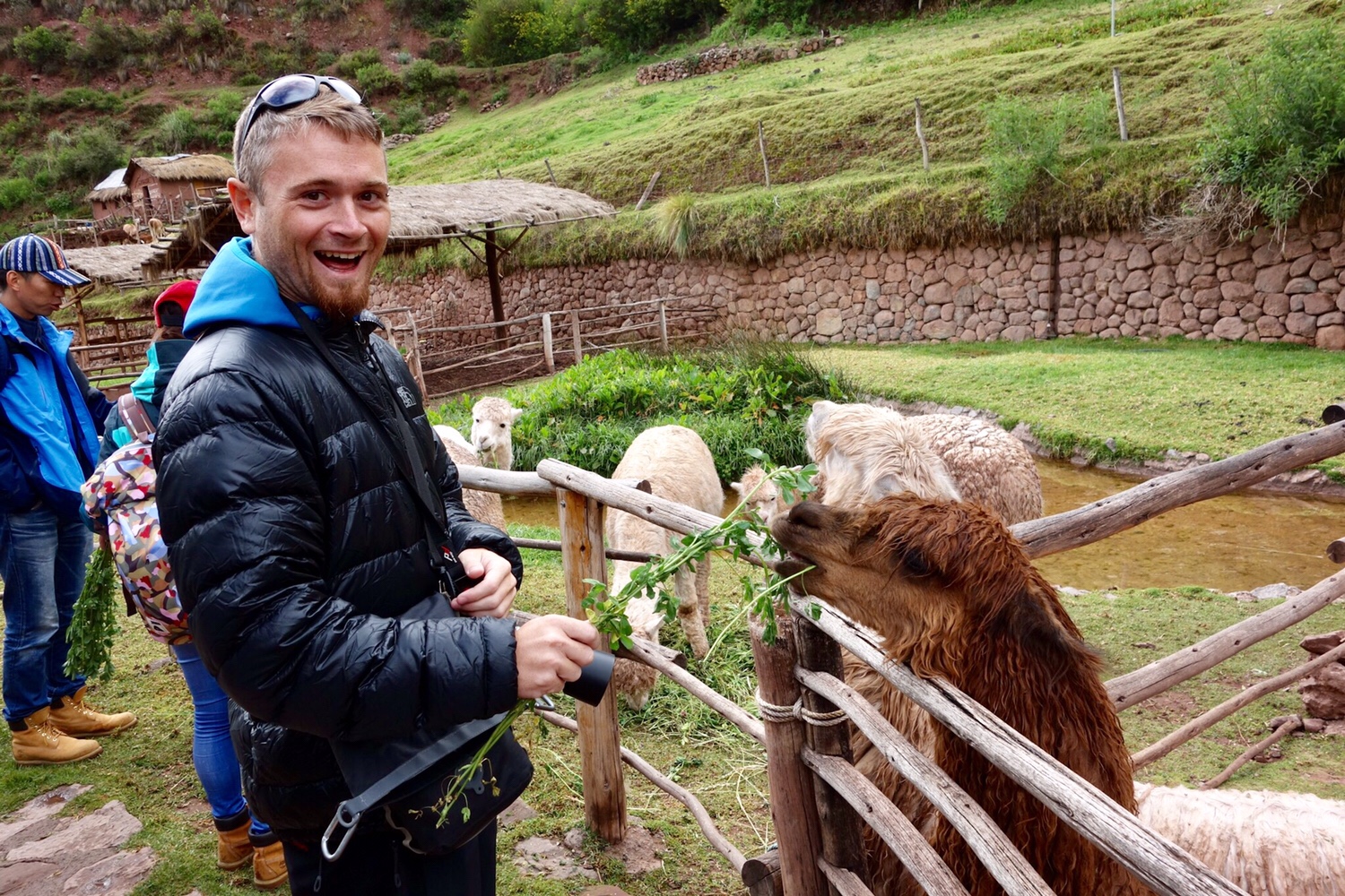 Die Tiere haben nichts anderes als fressen im Sinn und lassen sich so gut wie gar nicht streicheln, wie wir bei den Personen vor uns beobachten. Die Kameliden reissen an den saftigen Buschen Grünzeug, die wir ihnen hinhalten, als wäre es ihre Henkersmahlzeit.
