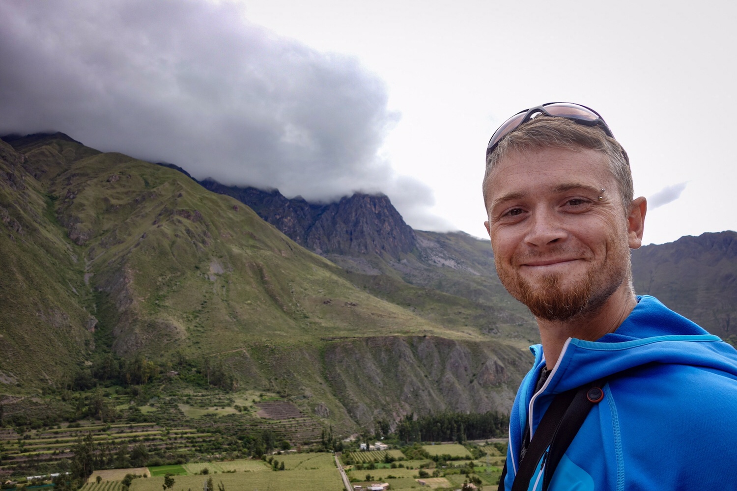 Bevor wir nach Pisac kommen, bleiben wir am Weg an einem Aussichtspunkt stehen. Das Panorama ist eine Wucht! Die Berge sind grün bewachsen und die Wolken liegen wie eine kuschelige Decke auf den Gipfeln.
