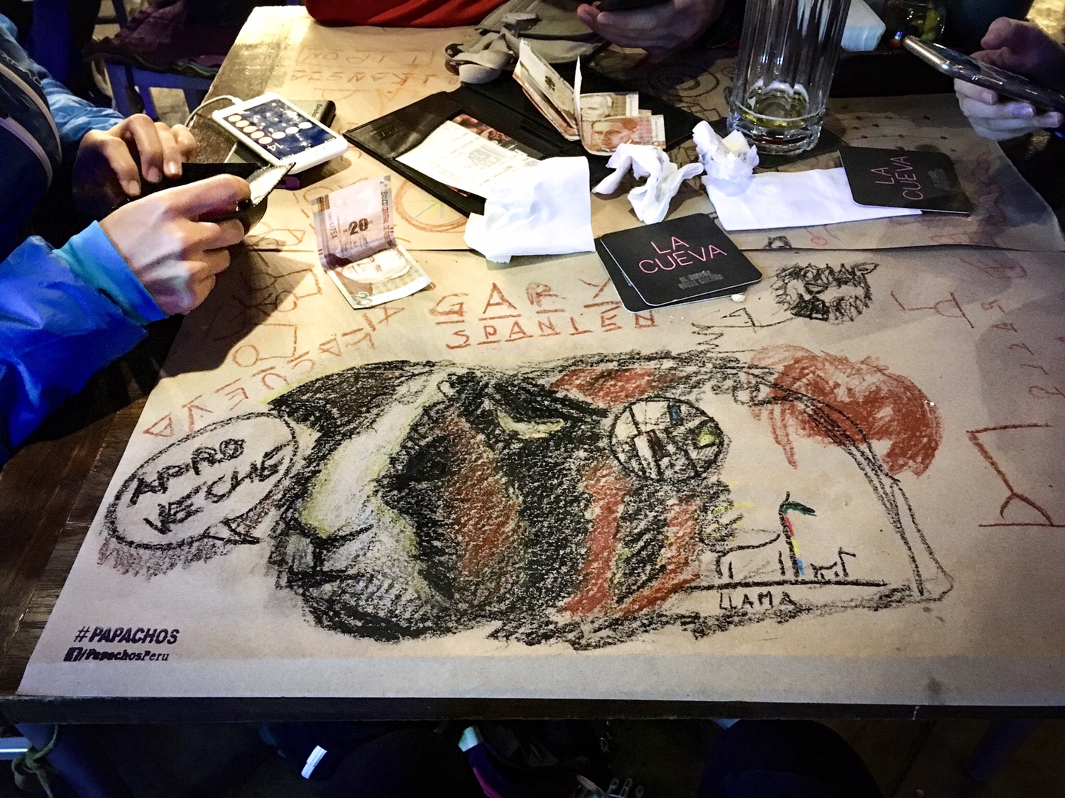In Cusco beziehen wir wieder ein Zimmer mit getrennten Betten. Da ich schon so genervt von den letzten drei Stunden bin, bleiben wir in diesem und stehen fĂŒr eine Nacht drĂŒber. Eva, Andi, Bernie und ich gehen in das Lokal, in dem wir an meinem ersten Tag in Cusco zu Mittag gegessen haben. Als Starter gibt es Schnaps und Bier, um den halben Tag zu feiern und die andere HĂ€lfte zu vergessen. Es gibt Ölkreiden und Papierunterleger am Tisch, die wir ordentlich zukritzeln. Mit Tic-Tac-Toe, Hangman und sonstigen Zeichnungen. Das vorgenommene Meerschwein bleibt dabei nur am Papier und kommt nicht auf den Teller. Es ist keiner in Experimentierlaune.