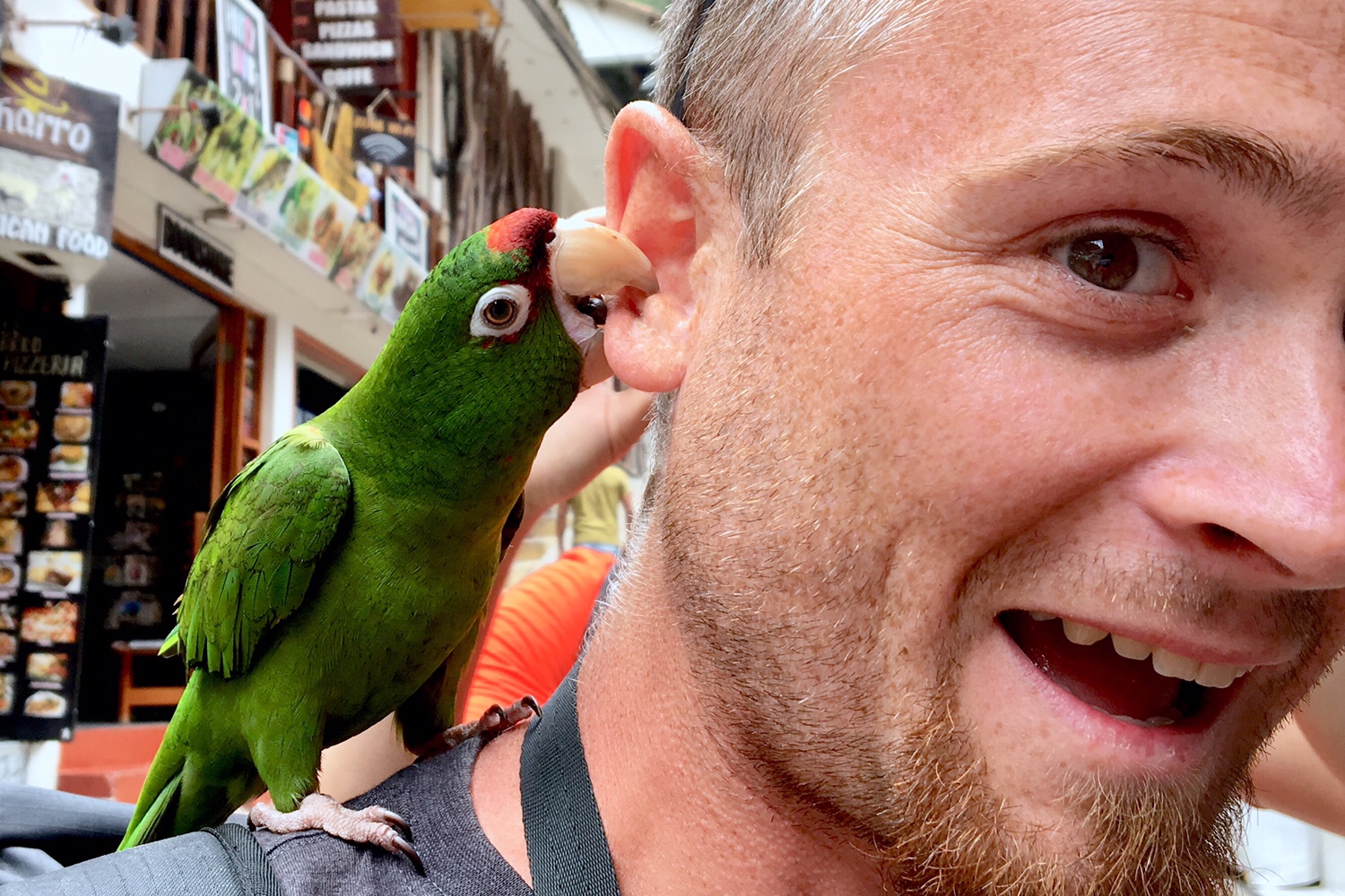 In Aguas Calientes gehen wir gemeinsam mit Steve aus New York City etwas essen. Auf der Suche nach einem Restaurant sehen wir eine Frau mit einem Papagei auf dem Gehsteig sitzen. Wir gehen zu ihr hin und fragen, ob wir Fotos machen dĂŒrfen. Sie bietet uns gleich an, den Vogel auf uns zu setzen. Er heißt Otto. Otto kraxelt von einer Hand auf die andere und gleich bis auf die Schulter, wie bei einem Piraten. Auf mir sitzt er auch und zwickt mich ins Ohr! Danach macht er dasselbe bei Andi, nur stĂ€rker. Genug – Otto muss zurĂŒck zur Vogelmama. Wir sind nĂ€mlich hungrig.