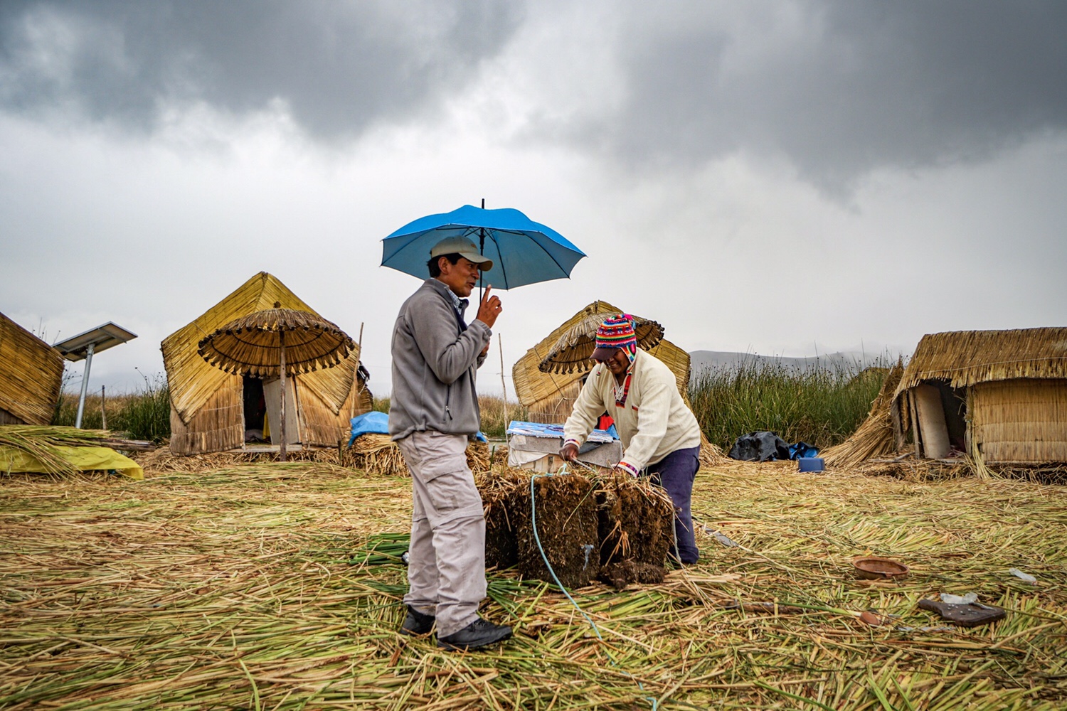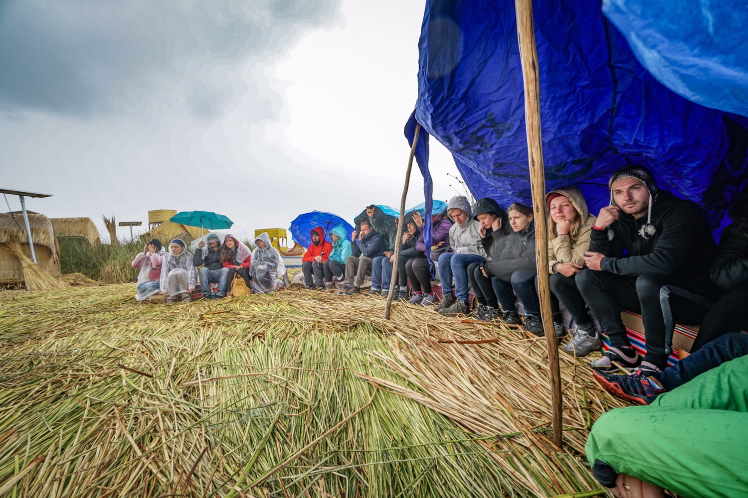 Wir werden von den Bewohnern freundlich begrüßt und bekommen Decken, um nicht im Nassen auf den Schilfbündeln sitzen zu müssen. Sie haben auch Planen für uns, mit denen wir den Regen einigermaßen fernhalten können. Vor unserem Halbkreis bekommen wir eine super Erklärung, wie die Inseln entstehen und wie die Menschen hier leben.