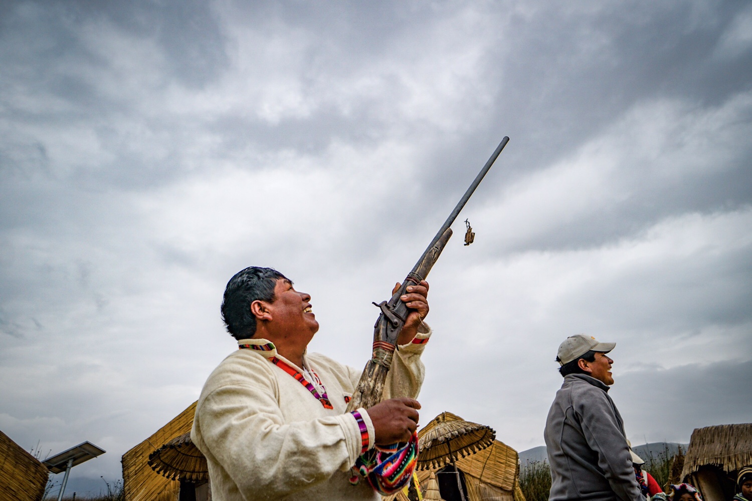 Das Oberhaupt der vier Familien, die auf dieser Insel leben, demonstriert, wie er mit einem alten Gewehr auf Entenjagd geht. Als er einen Schuss nachmacht, wirft seine Frau eine tote, verdörrte Ente von hinten in die Mitte unseres Halbkreises. Das war lustig, weil wir überhaupt nicht damit gerechnet haben.