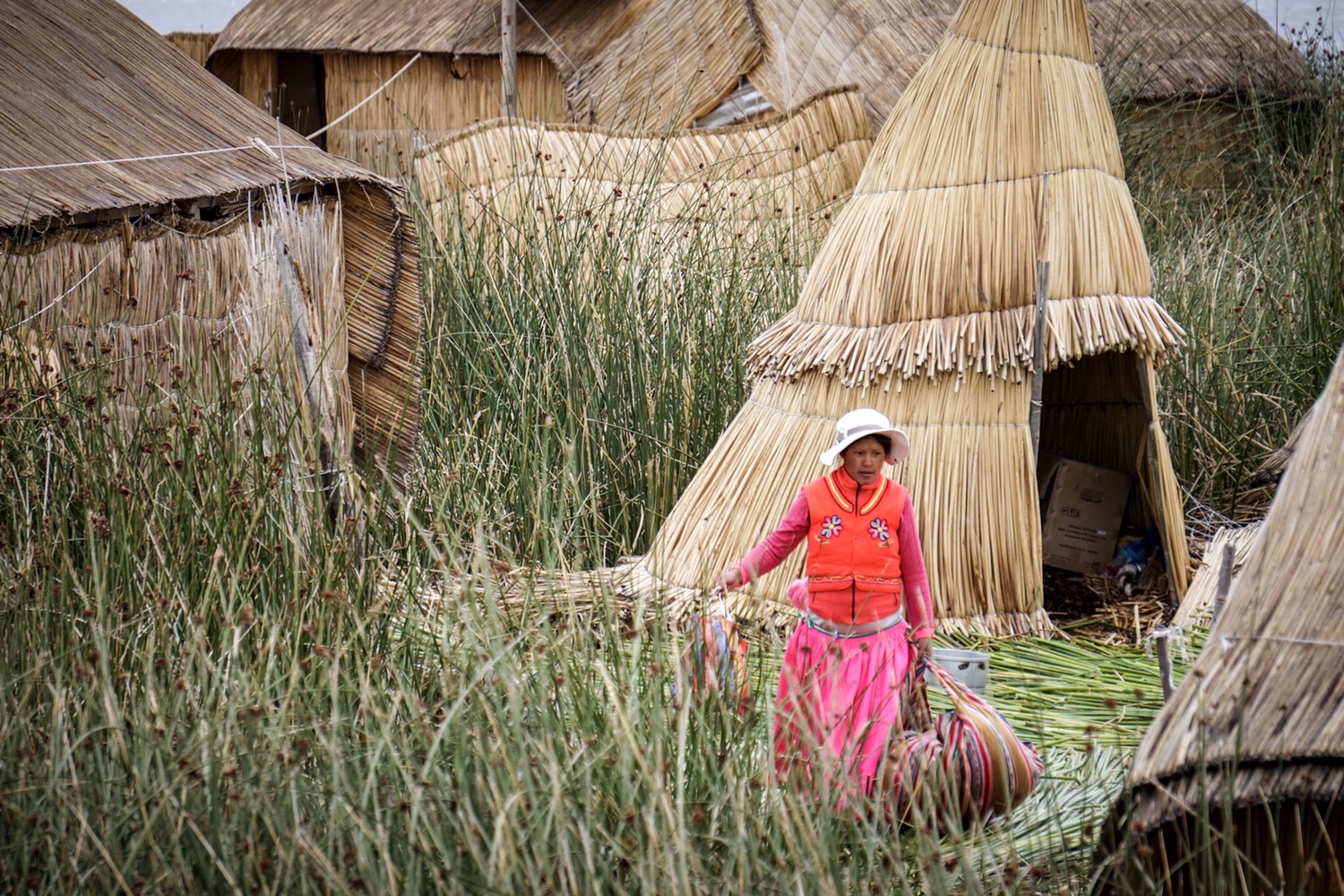 Die Uros bauen aus torfähnlichen Blöcken den Untergrund der Insel. Danach werden im Wochentakt Schilflagen überkreuz auf die Blöcke gelegt – bis zu einem Meter dick. Dann kann man als Fundament der winzigen Häuser noch weiter kleine Flächen mit Schilf höher schichten. Die Häuser sind sehr einfach und bieten nur wenigen Personen Platz. Bleiben die Leute an einem Ort, müssen sie die Insel mit Ankern an der Position halten. Sie können die Anker aber auch lichten und mit dem kompletten Dorf weiterziehen.
