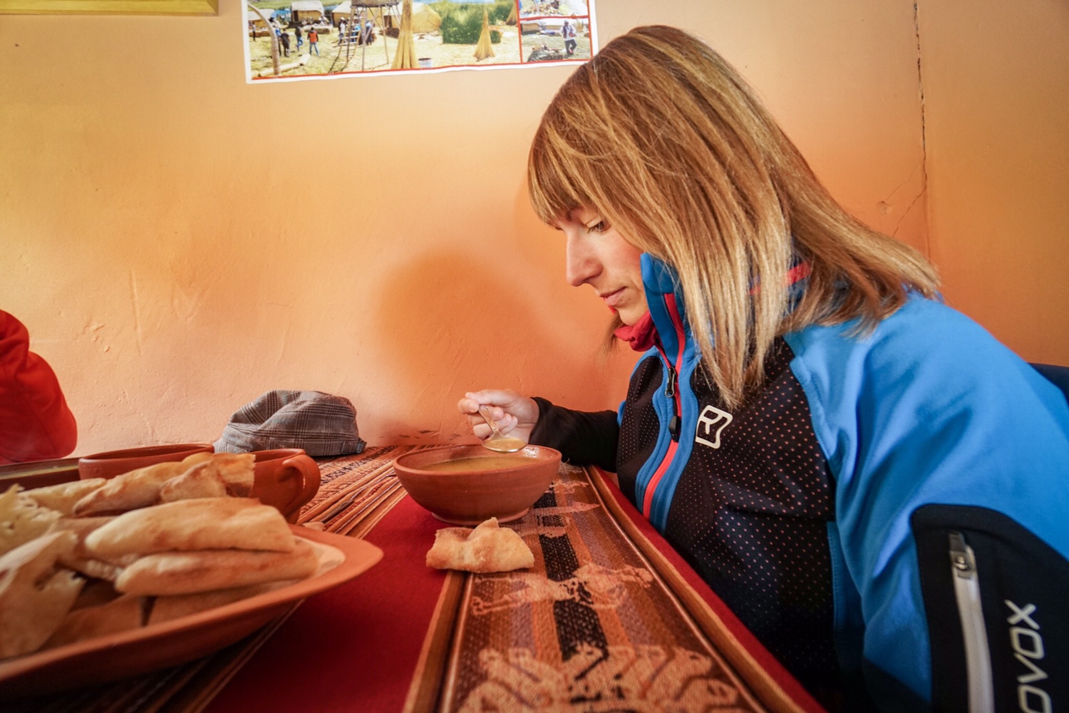 Der erste Gang ist eine Suppe mit Quinoa, Erdäpfel und Gemüse. Dazu gibt es Fladenbrot und Tee. Dann kommt die Hauptspeise: gebratener Käse, ein Stück Maiskolben, rohes Gemüse und drei verschiedene Arten Kartoffeln. Kartoffelarten gibt es in Peru übrigens über 3.000. Das Essen ist für uns OK, schmeckt und reicht.