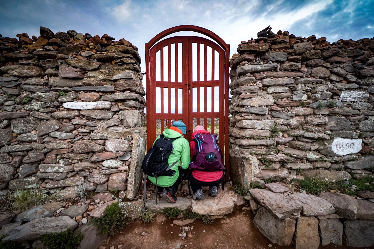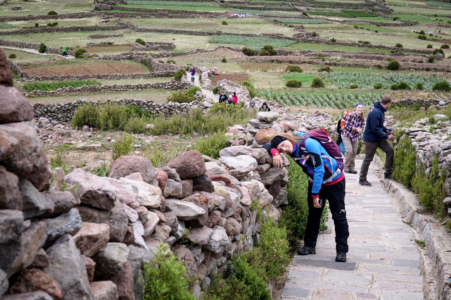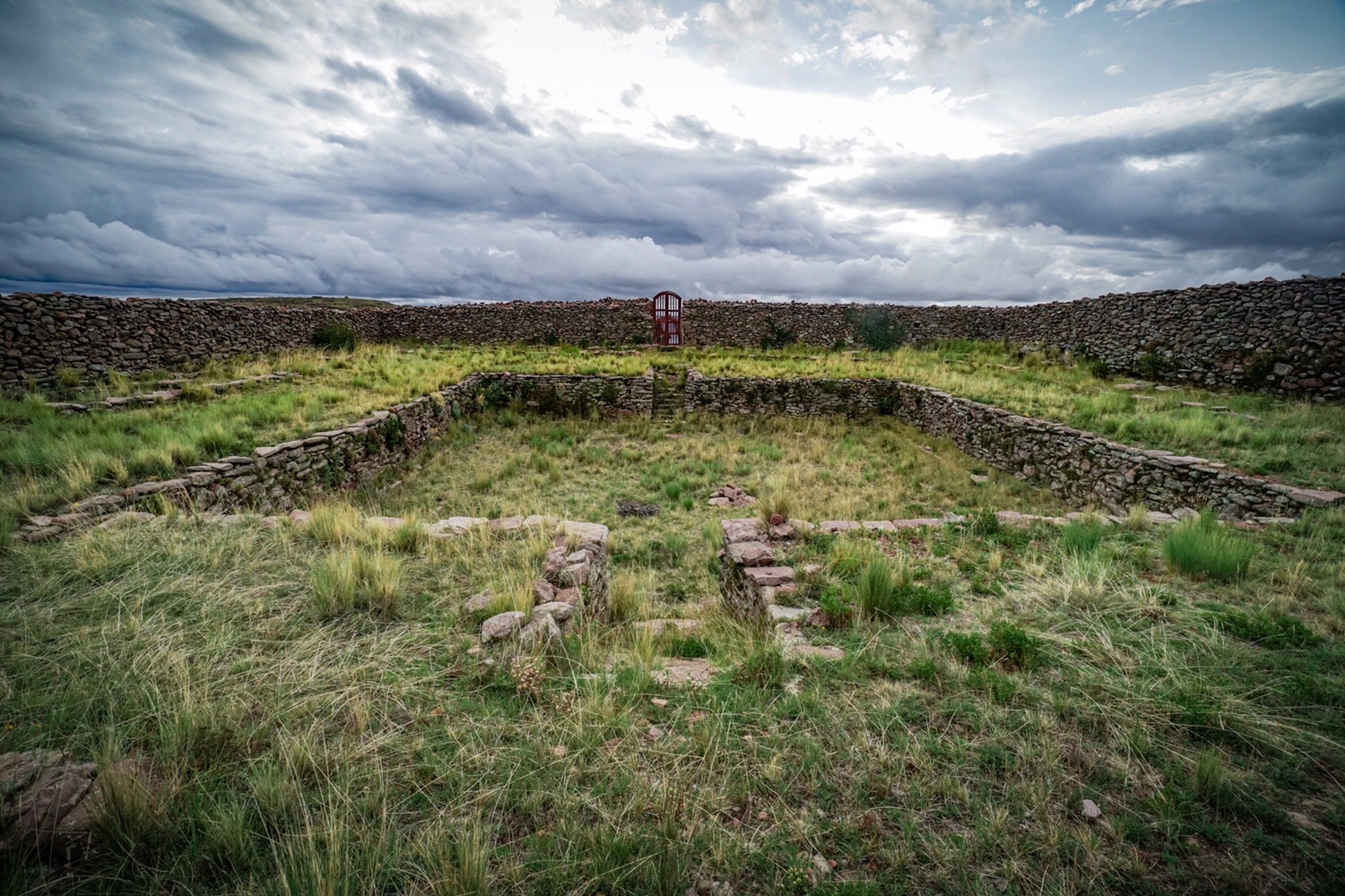 In der Mitte des Plateaus gibt es einen quadratisch angelegten Tempel. Hier werden zu bestimmten Tagen spirituelle Feste gefeiert und neben Kokablättern auch Lamaföten geopfert. Obwohl heute kein Fest auf der Agenda steht, können wir entweder drei Kokablätter mit einem Wunsch niederlegen, oder wenn man gerade keine Blätter zur Hand hat, kann man drei Runden gegen den Uhrzeigersinn um die Steinmauer des Tempels laufen, um seinen Wunsch der Erfüllung näher zu bringen. Da Bernie und ich keine Blätter haben, gehen wir die drei Runden.