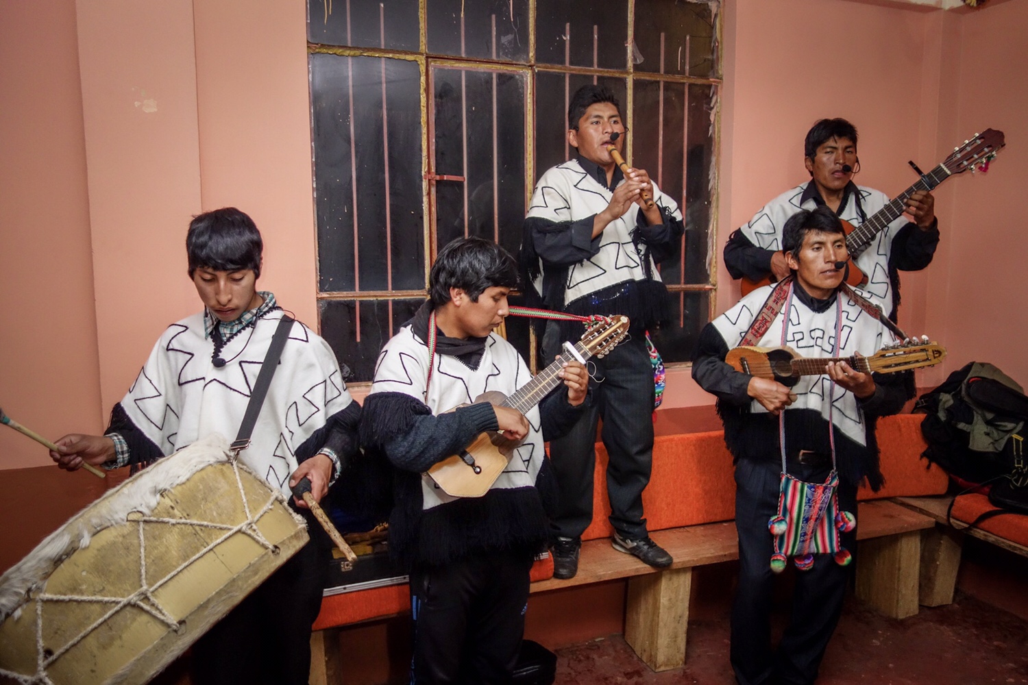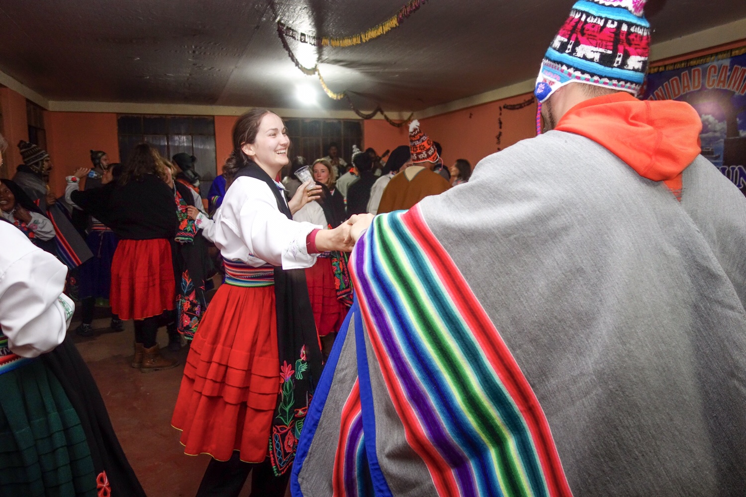 Wir brauchen jetzt etwas gegen den Durst. Die Bar ist ein gewöhnlicher Tisch und die simple Kassa ist der Bereich unter dem Tischtuch. Es gibt Cola, Inca-Kola, Wasser und Cusqueña Bier in vernünftigen 660 ml Flaschen. Andi und ich nehmen jeweils eine und teilen mit unseren Begleitungen. Registrierkassenbon haben wir keinen erhalten. Ehe wir‘s uns versehen packt uns jemand von hinten und in Sekundenschnelle sind wir mitten in der Polonaise, die sich durch den ganzen Saal schlängelt.